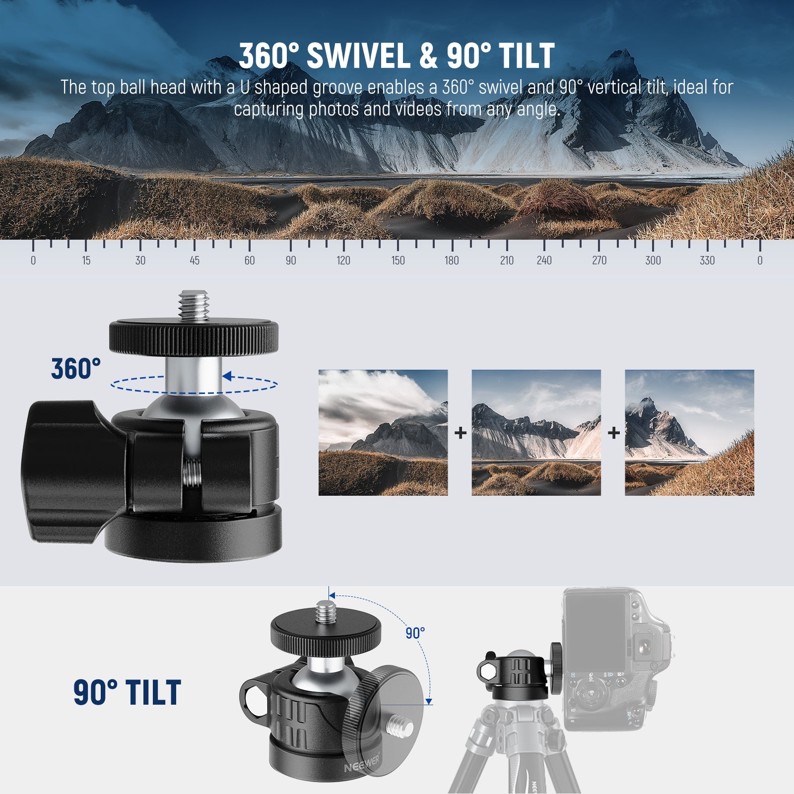 - Rotazione a 360° e inclinazione a 90° : la testa sferica superiore con scanalatura a U consente una rotazione a 360° e un'inclinazione verticale a 90°, ideale per catturare foto e video da qualsiasi angolazione e rendendolo essenziale per i creatori di contenuti e indispensabile per gli influencer.