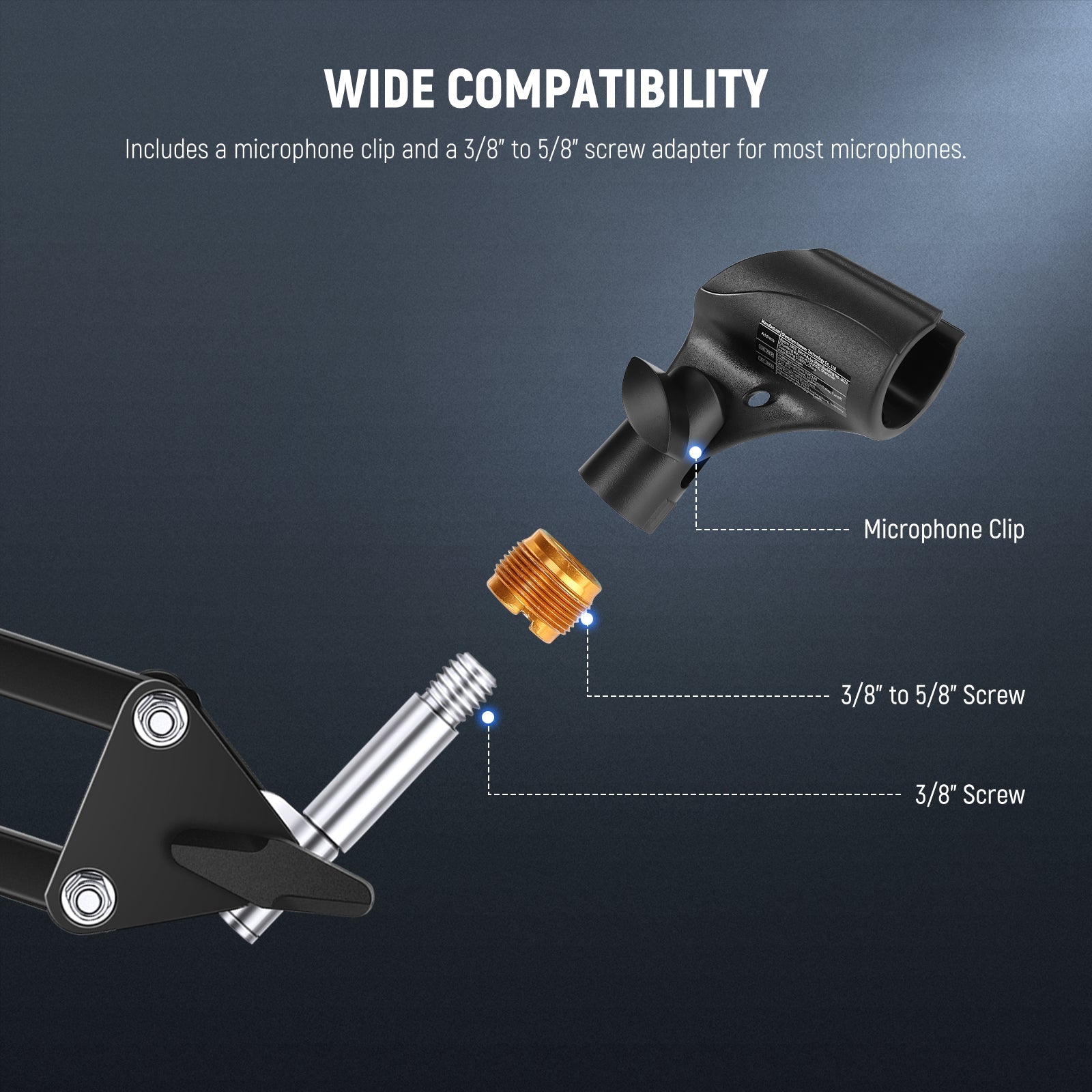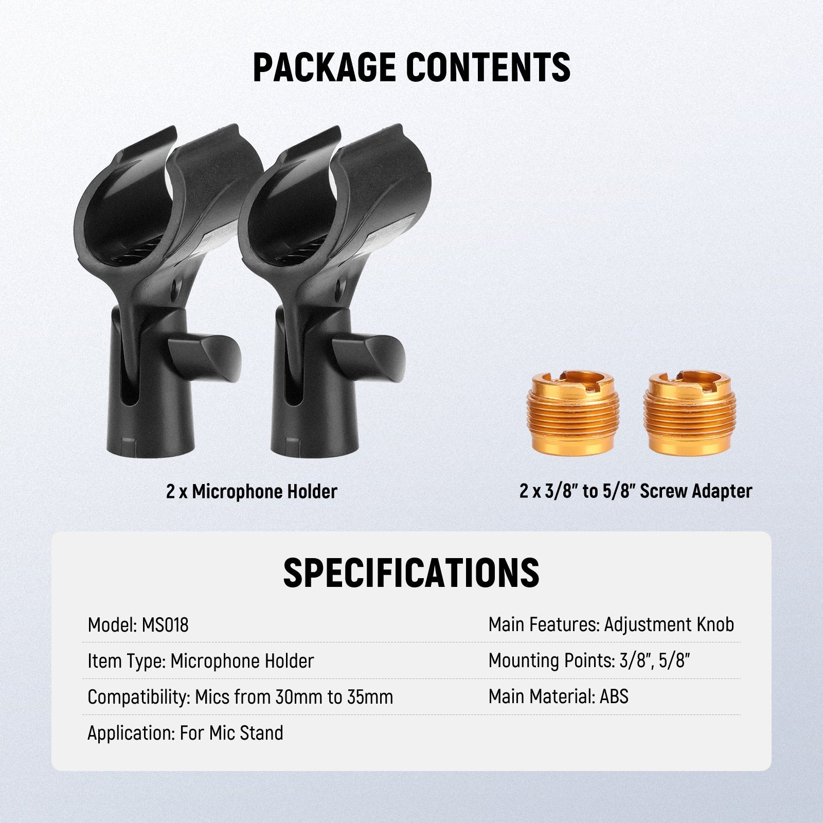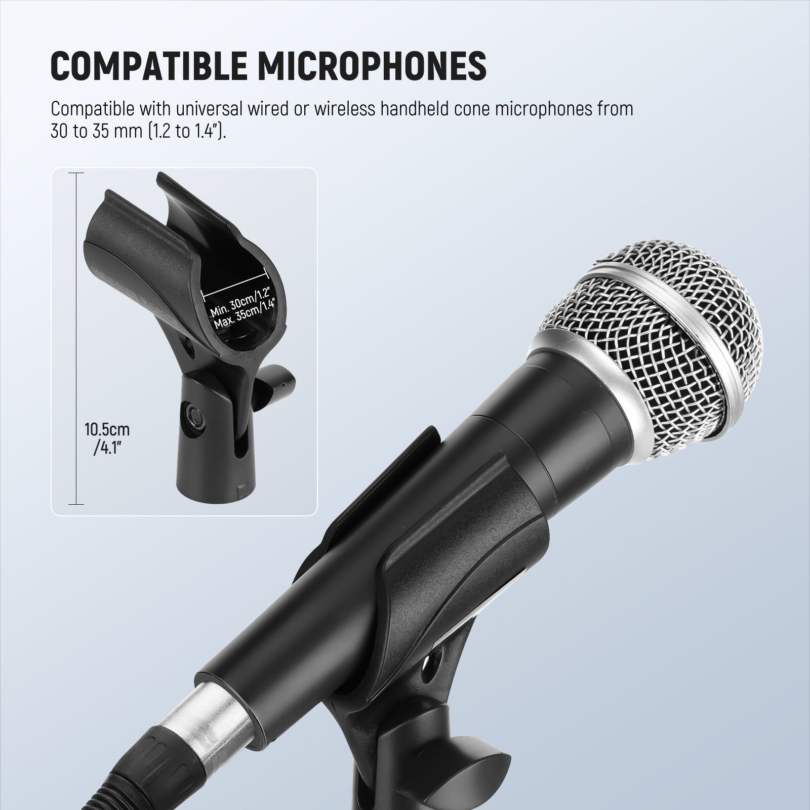 - Wide Compatibility- The microphone clamp comes with two 3/8" to 5/8" screw adapters, compatible with universal wired or wireless handheld cone body mics from 28mm to 35mm (1.1" to 1.4")