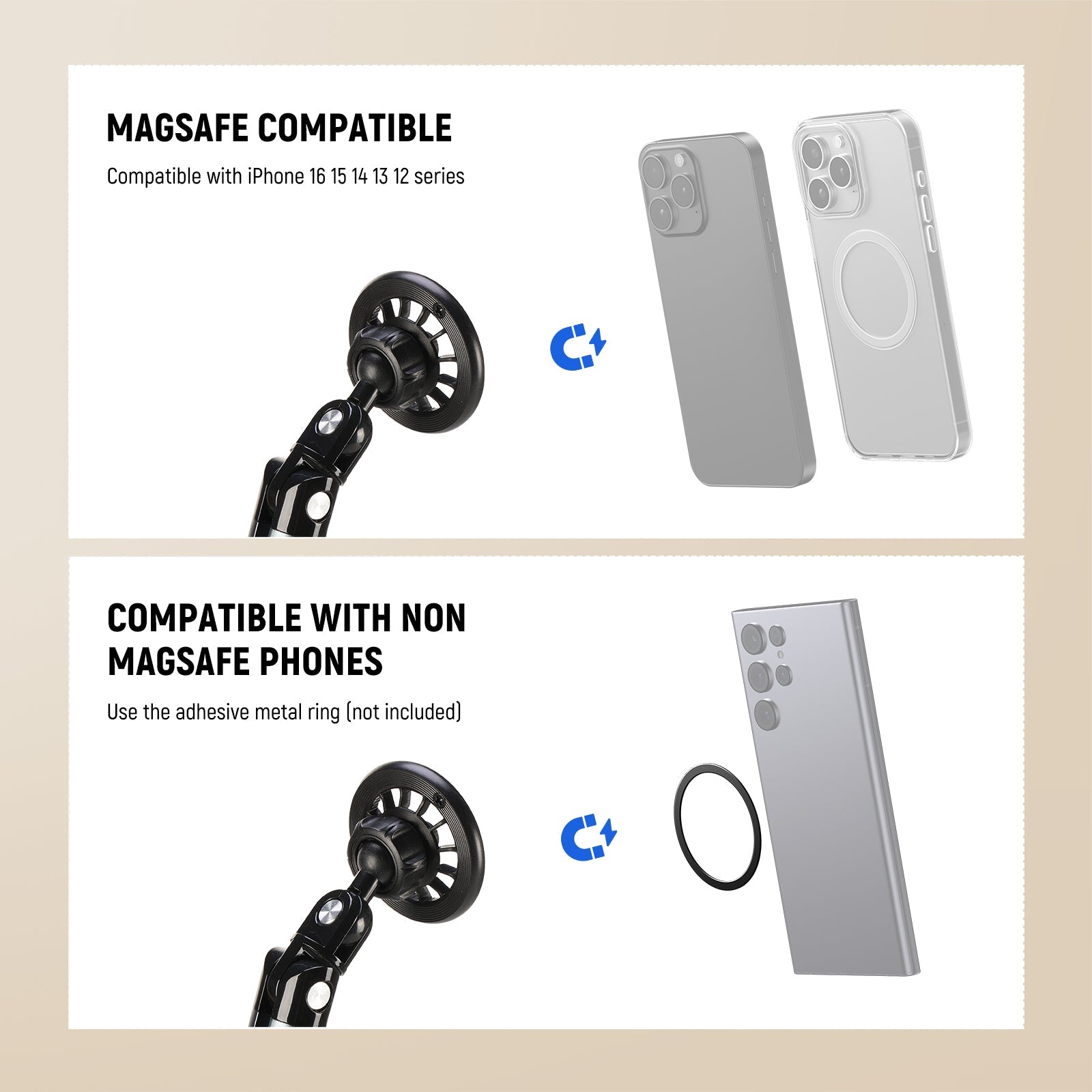 - Supporto da scrivania versatile per telefono - Il supporto da scrivania per telefono fissa magneticamente il tuo smartphone a comodini, tavolini da caffè o ripiani della cucina, offrendo un angolo di visione più comodo per selfie, chiamate Zoom, registrazioni video, streaming live e persino conferenze online, apprendimento a distanza e streaming di giochi. Ideale come accessorio essenziale per i creatori di contenuti e accessorio indispensabile per gli influencer, per un utilizzo più versatile.