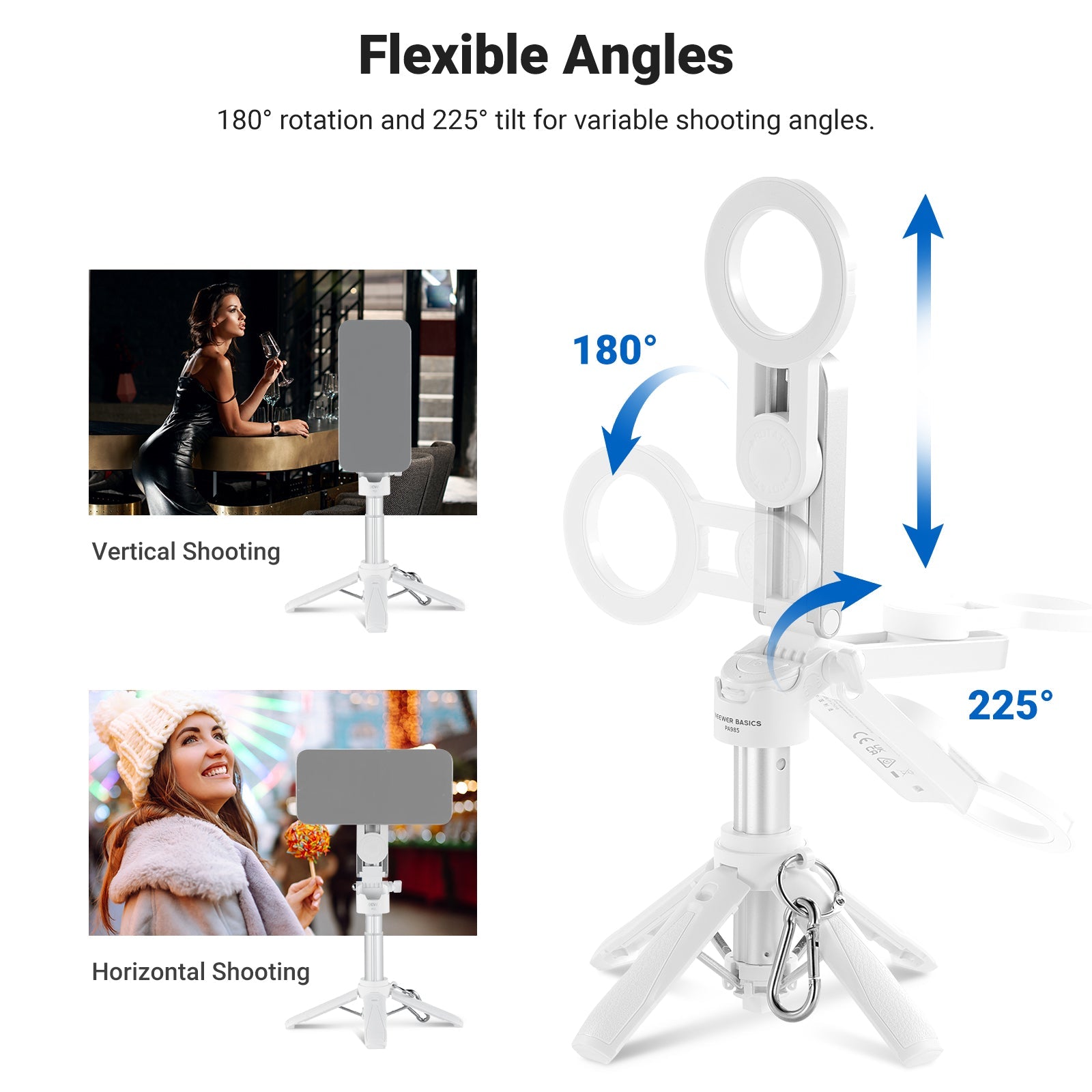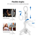• 360° Universal Phone Holder- With a 2.4"-3.3"/60-85mm opening range, the phone clamp is compatible with iPhone 16 Pro Max iPhone 15 Pro Max Samsung Galaxy S24 Ultra and other smartphones. The 360° rotation allows for vertical and horizontal shooting, while the 225° tilt offers variable camera angles