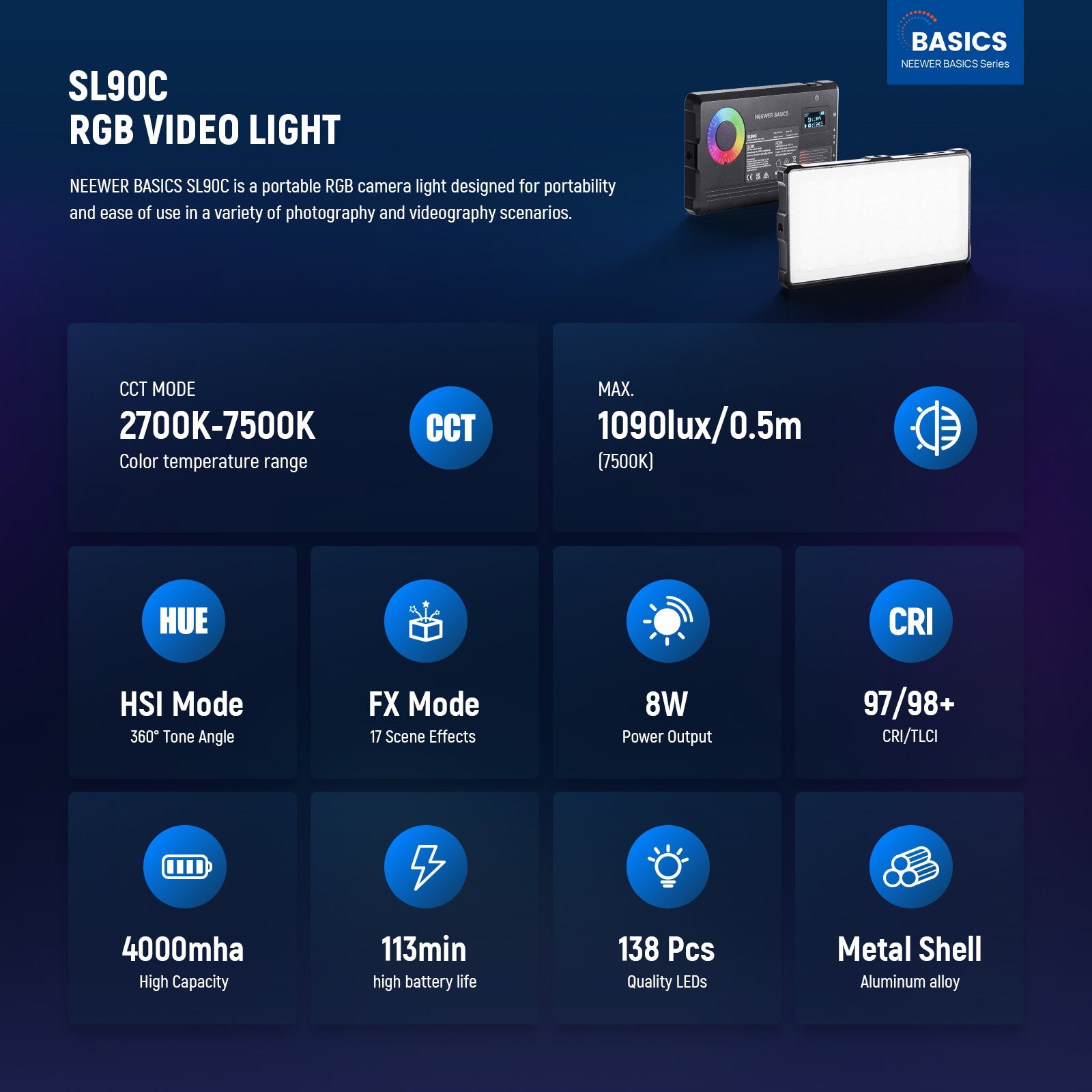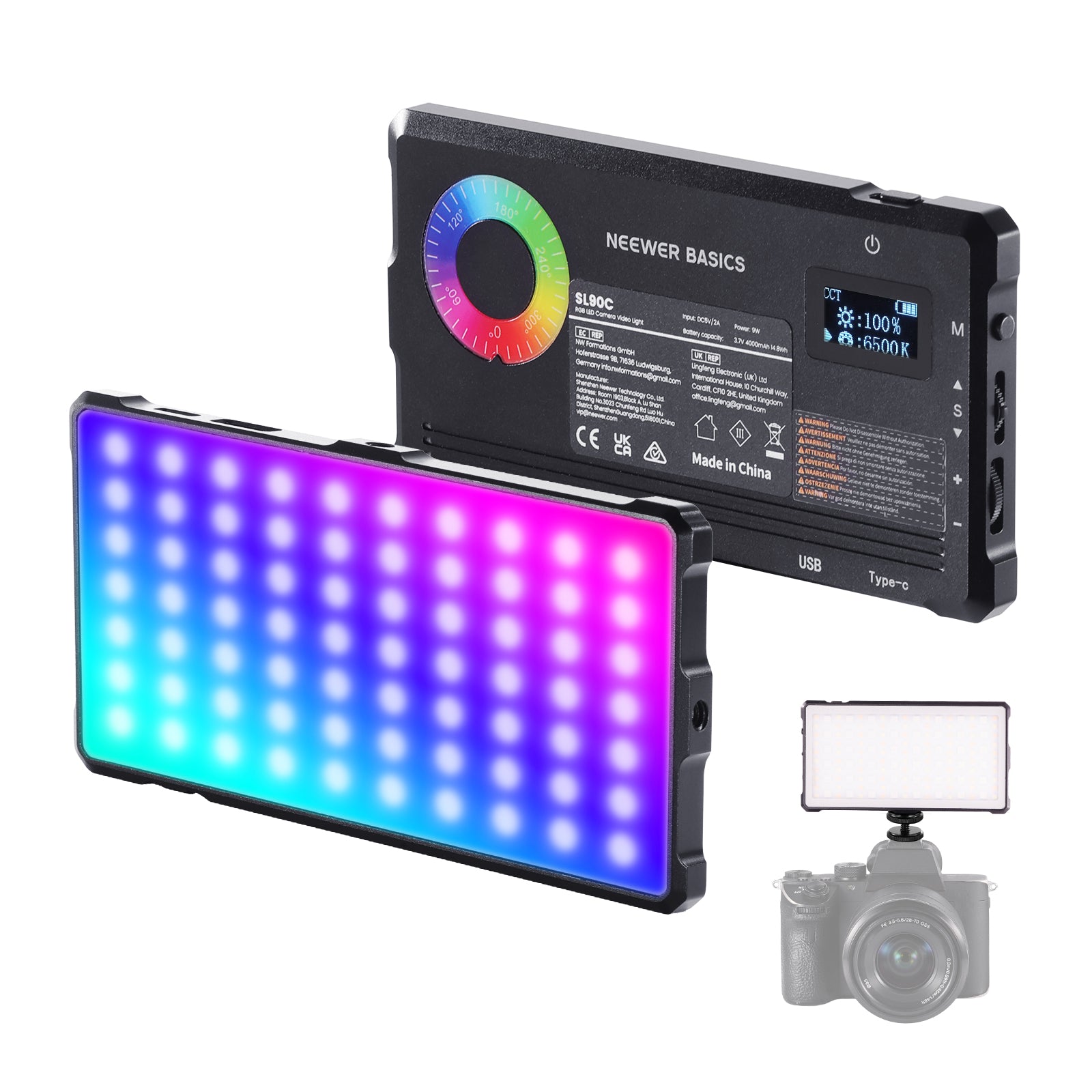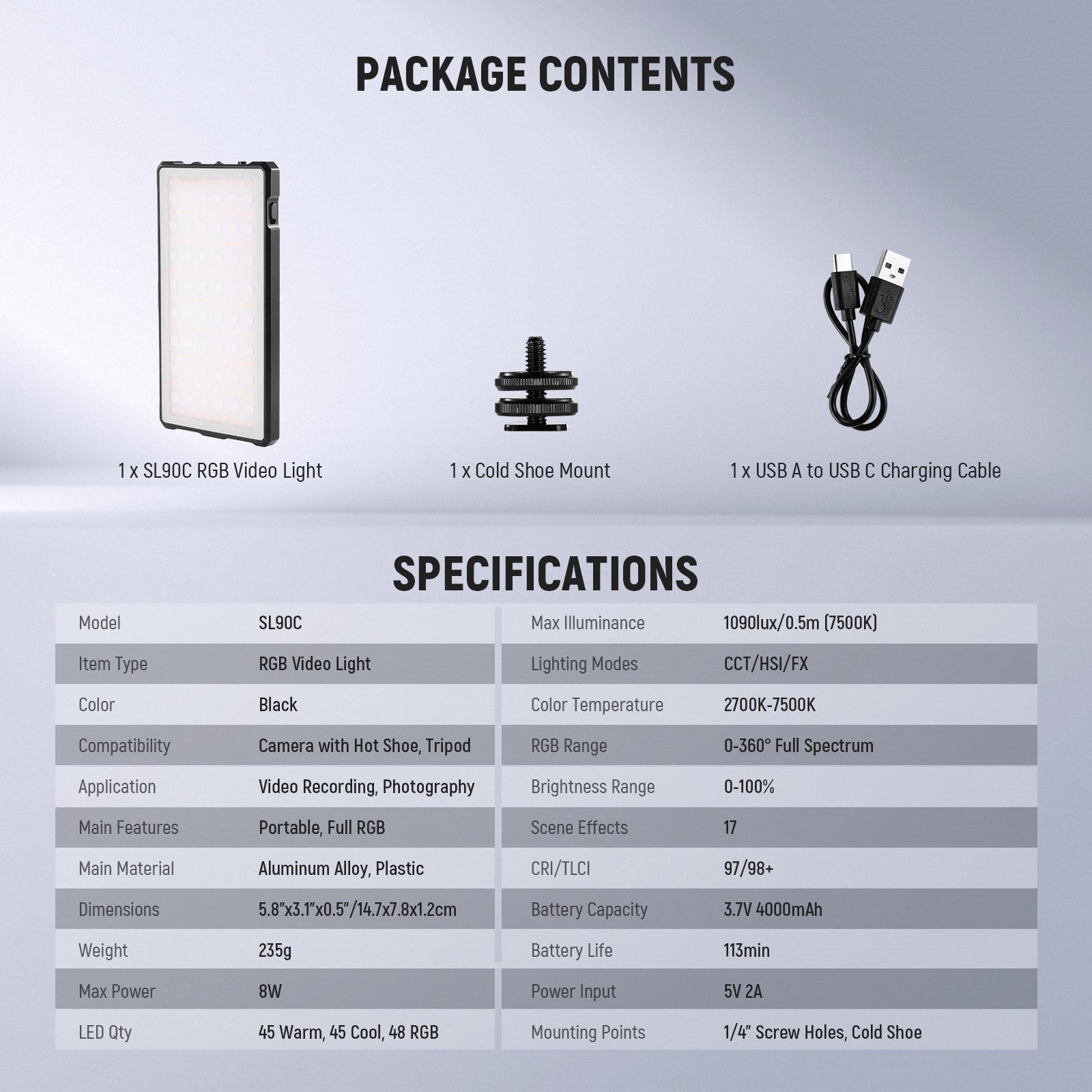 - Portable Metal Camera Light for On the Go- Made of lightweight yet robust aluminum alloy, the SL90C is a portable LED RGB camera selfie soft continuous light designed for flexible use in a wide range of photography and videography lighting scenarios. Measuring just 5.9"x3.1"x0.5"/15x8x1.2cm and weighing only 8.3oz/235g, it easily slips into your pocket for effortless transport