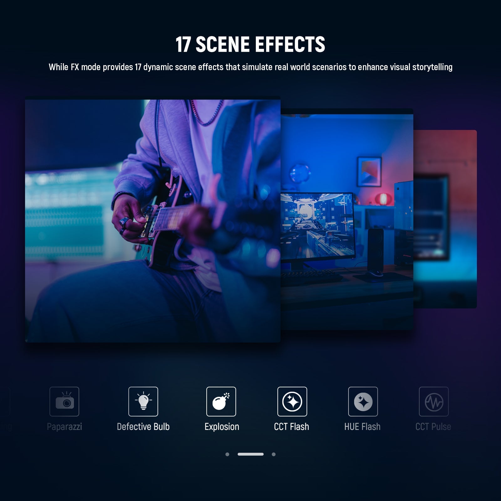 - Full Color Camera Light with CCT/HSI/FX- Featuring 45 warm, 45 cool, and 48 RGB LED blended, this on camera light delivers up to 984lux/0.5m with 3 lighting modes: CCT/HSI/FX. In CCT mode, it offers color temperature range from 2700K-7500K with stepless brightness control from 0-100%. HSI mode enables full spectrum color output with 360° H selection for rich, customizable tones, while FX mode provides 17 dynamic scene effects that simulate real world scenarios to enhance visual storytelling