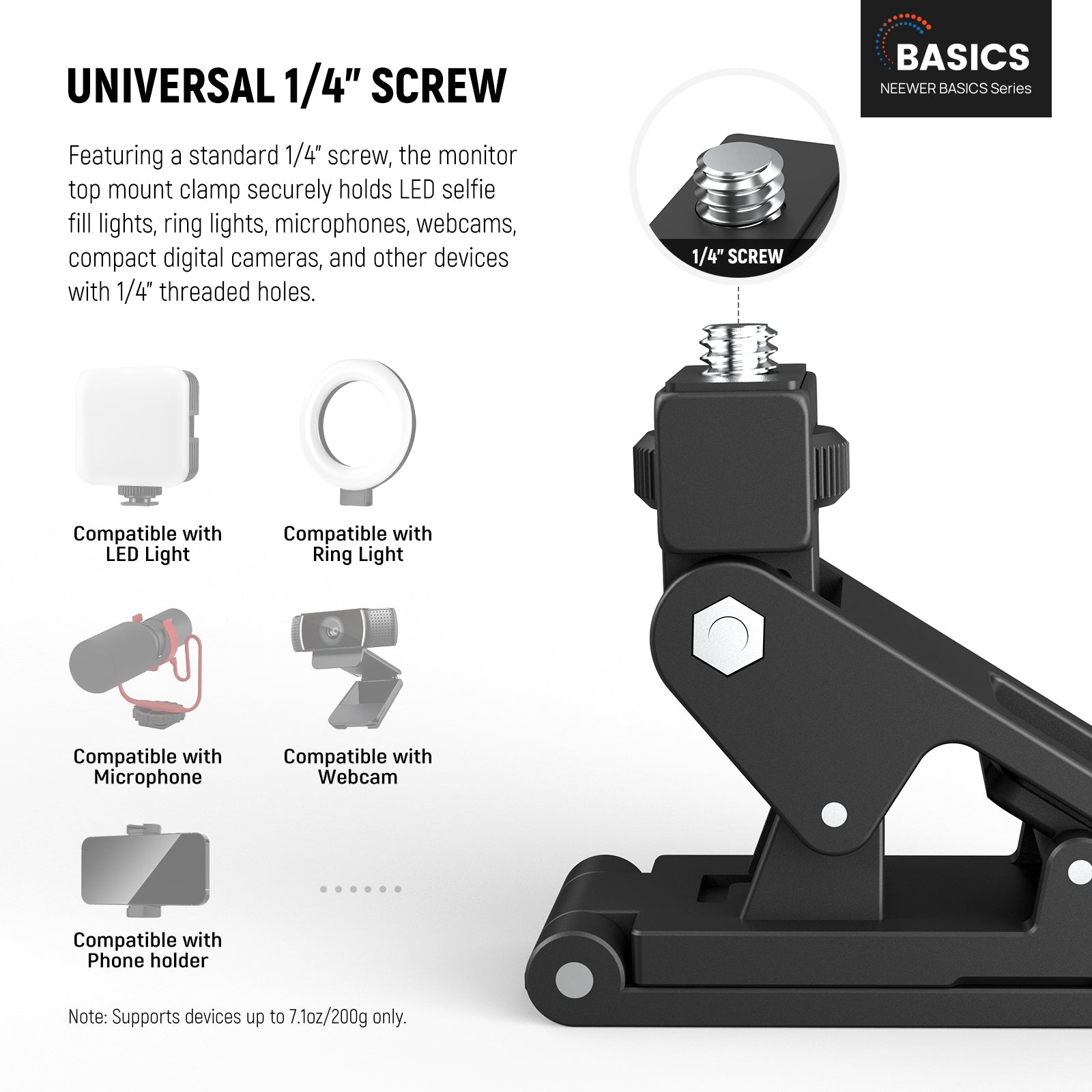 • Universal 1/4" Screw- Featuring a standard 1/4" screw, the monitor top mount clamp securely holds LED selfie fill lights, ring lights, microphones, webcams, compact digital cameras, and other devices with 1/4" threaded holes. Note: Supports devices up to 7.1oz/200g only