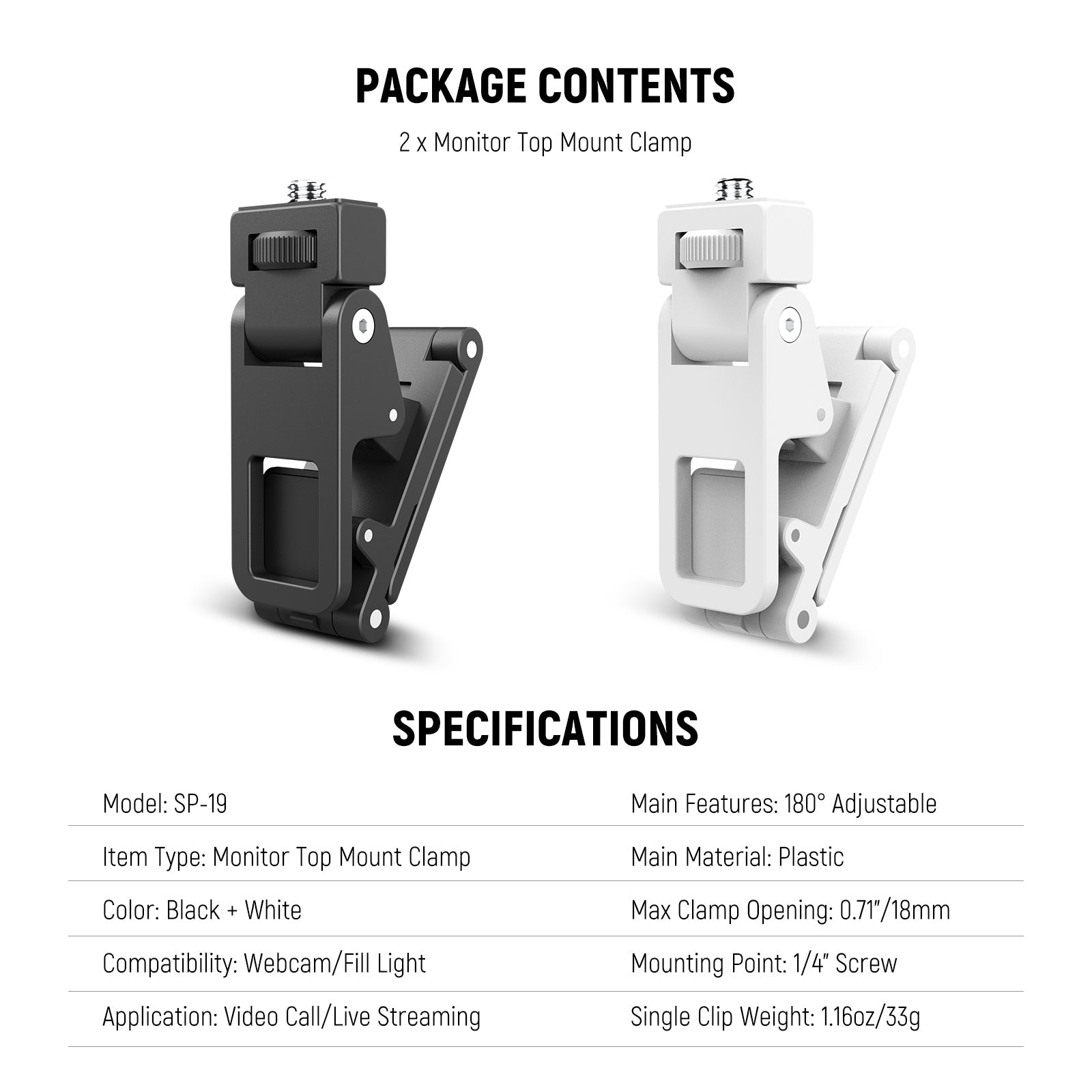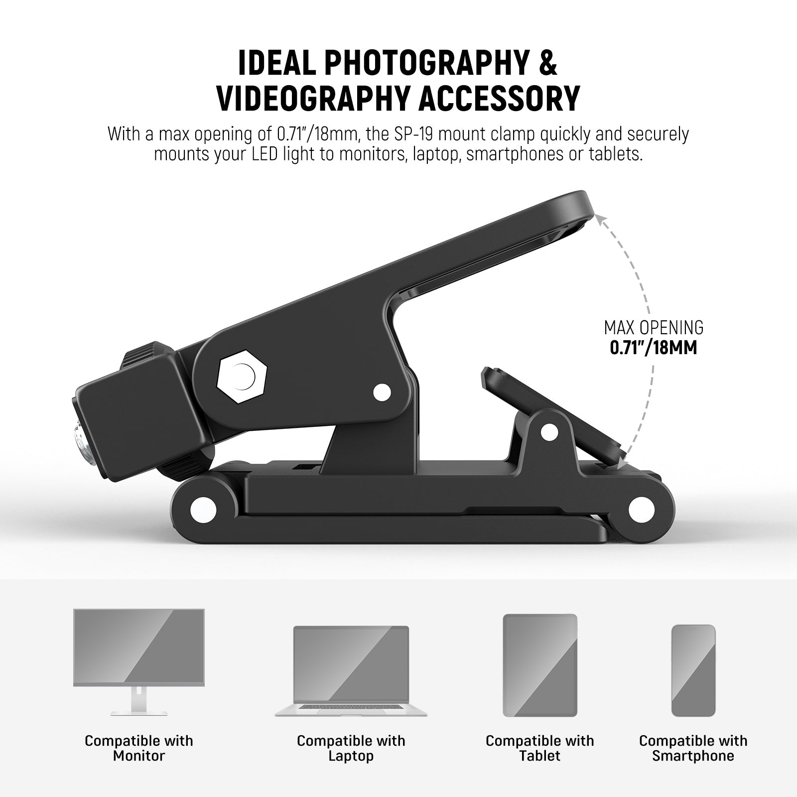 • Ideal Photography & Videography Accessory- With a max opening of 0.71"/18mm, the SP-19 mount clamp quickly and securely mounts your LED light to monitors, computer cameras, displays, laptop, smartphones for TikTok YouTube video recording filming, video conferencing, zoom calls, live streaming, selfies, vlogs, and more, or tablets, ideal as essential accessories/must have lighting gear for professional photographers & videographers, content creators, streamers, and social media influencers