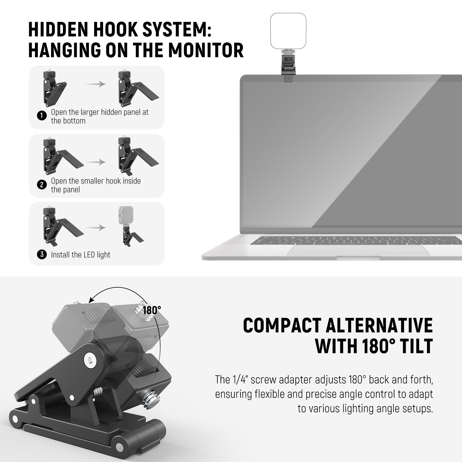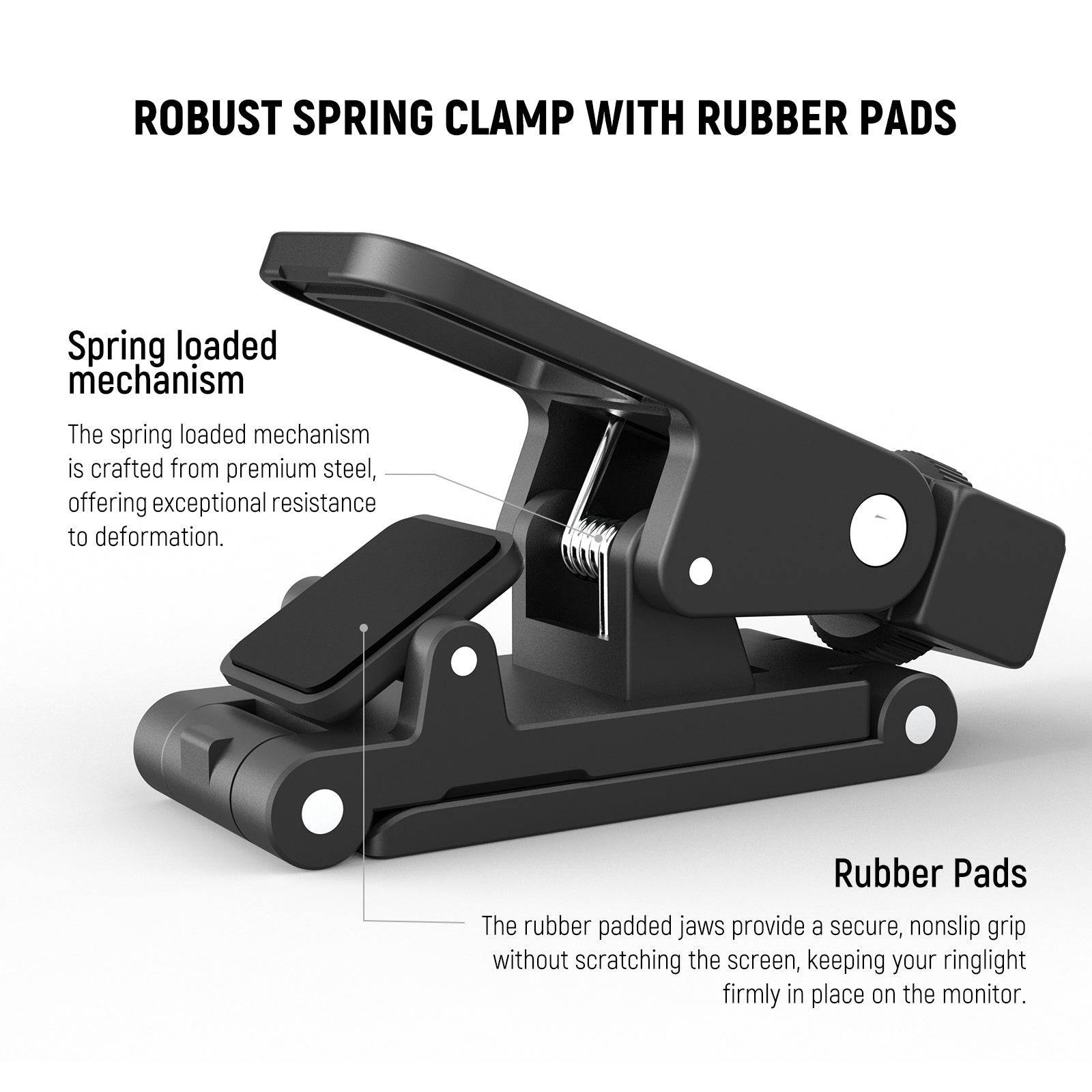 • Robust Spring Clamp with Rubber Pads- The spring loaded mechanism is crafted from premium steel, offering exceptional resistance to deformation. The rubber padded jaws provide a secure, nonslip grip without scratching the screen, keeping your ringlight firmly in place on the monitor. Also with a built in hook for convenient hanging on the monitor