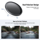 - Removing the X Pattern- A dark X pattern (or X vignetting) may appear at the max ND value. This is common when the variable ND filter, with its two polarizing filters aligned at a specific angle, interacts with certain lenses and focal lengths. To fix it, reduce ND values