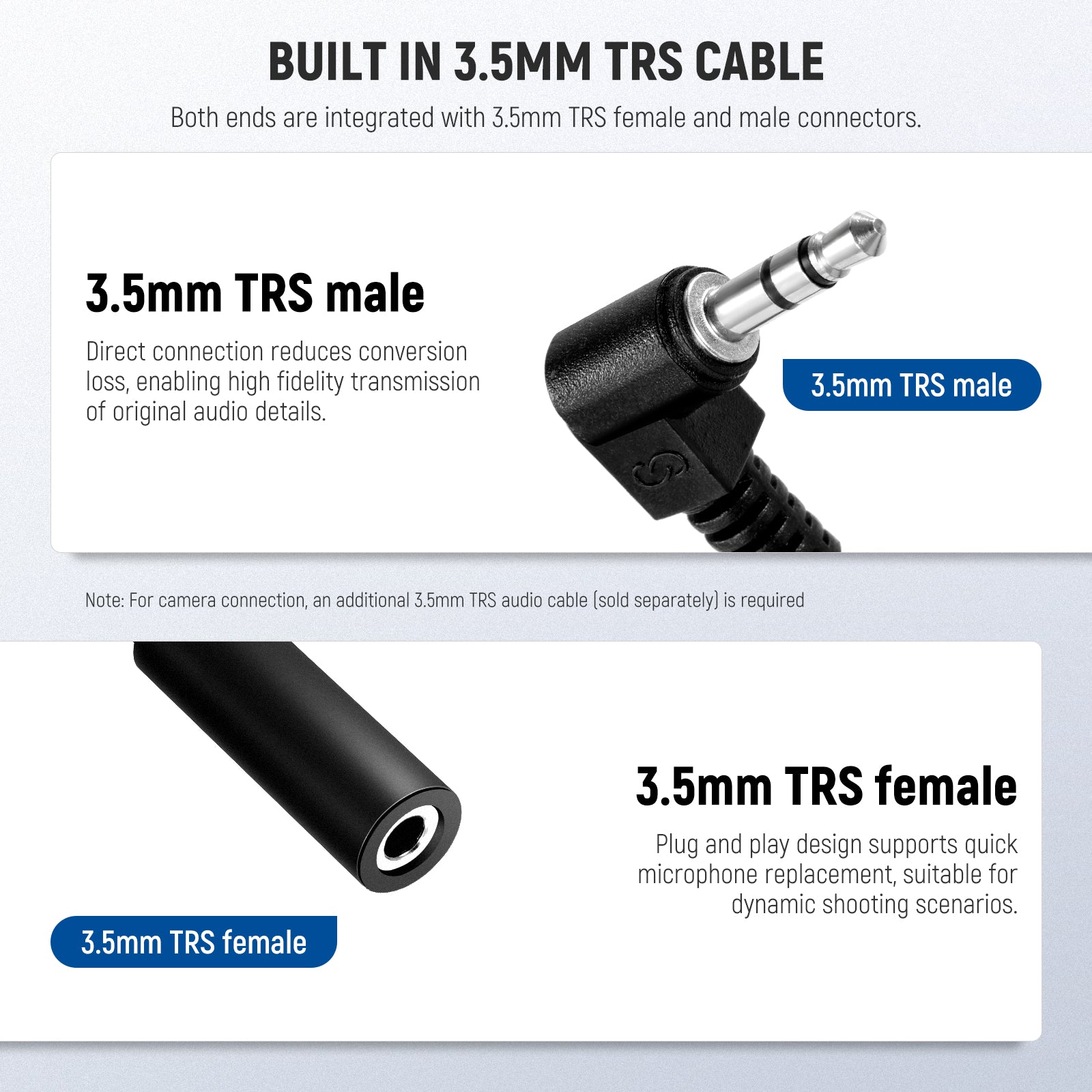 - Built In 3.5mm TRS Cable- Integrated 3.5mm TRS male to female cable simplifies the connection between microphone and camera/camcorder. Plug the male connector into your mic and the female connector into your camera. Note: For camera connection, an additional 3.5mm TRS audio cable (sold separately) is required