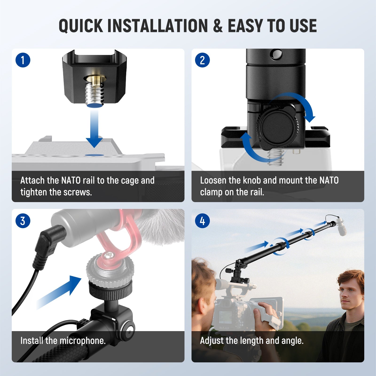 - Fast NATO Rail Mounting- Designed for rapid connection, this boompole features a NATO clamp that instantly connects to camera cages, video rigs, or shoulder rigs with a built in NATO rail. For rigs without one, an external NATO rail with 1/4" screw is included for you to enjoy fast and simple mounting the entire time