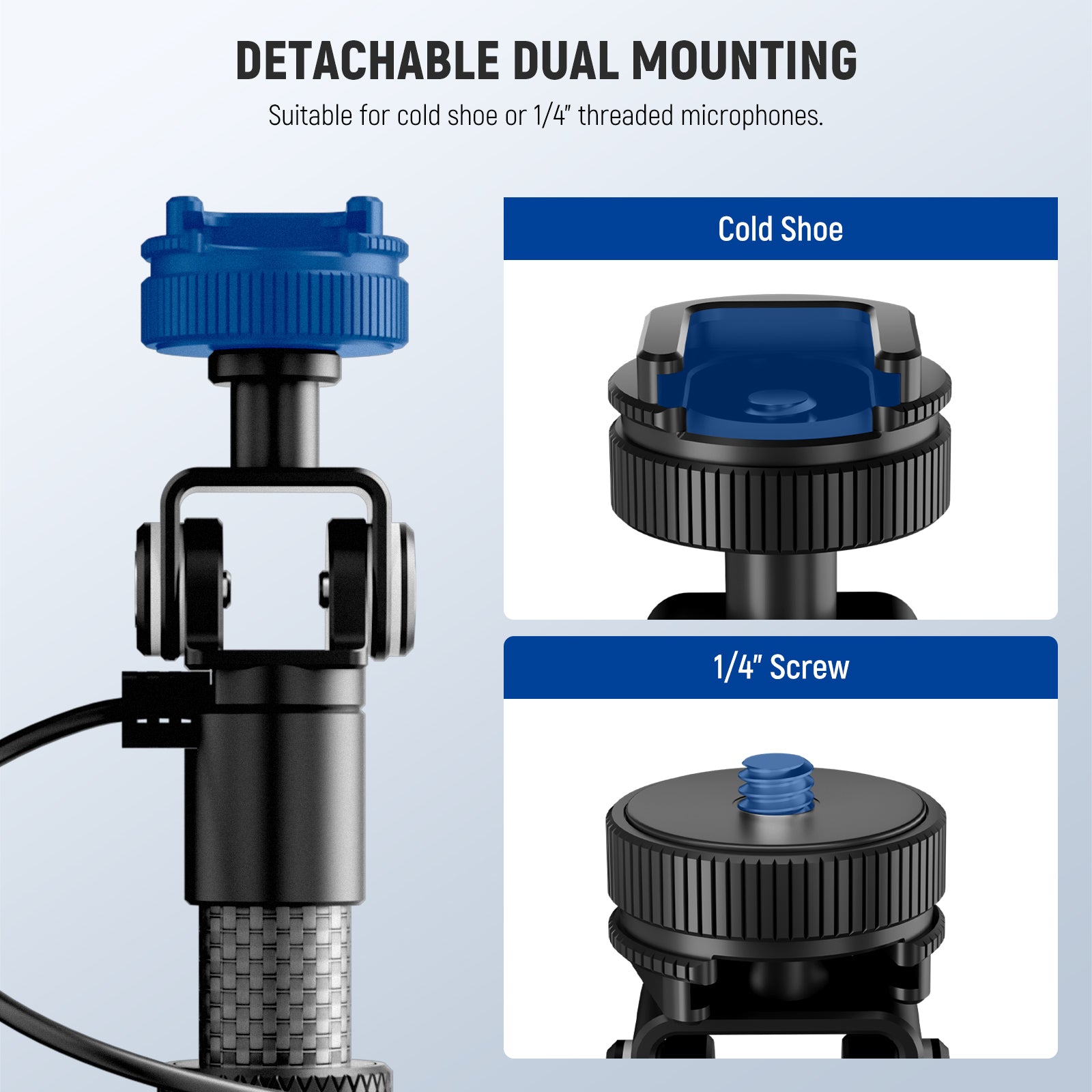 - Cold Shoe and 1/4" Screw- The top part employs a 2 in 1 design—the cold shoe connects camera microphones, and the 1/4" screw (after removing the cold shoe) connects more professional audio devices