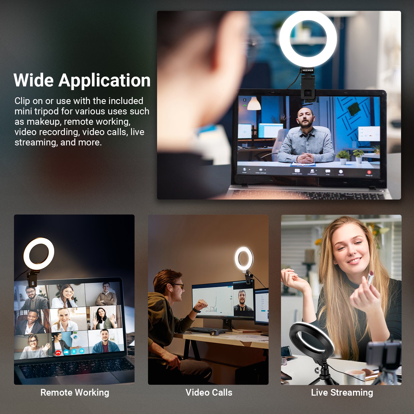 - Luce di riempimento LED versatile con clip - Dotata di 60 LED, la luce ad anello NEEWER BR60 offre fino a 450Lx di illuminazione a 0,5 m, temperatura di colore 3000K-6000K e CRI>97. La luce a clip può essere montata su smartphone, laptop, computer, display desktop e monitor con uno spessore inferiore a 1"/2,5 cm e include un mini treppiede per un utilizzo versatile nel trucco, selfie, registrazione video Tiktok/Youtube, Facetime, chiamate Zoom, videoconferenze, streaming live, vlogging, ecc.