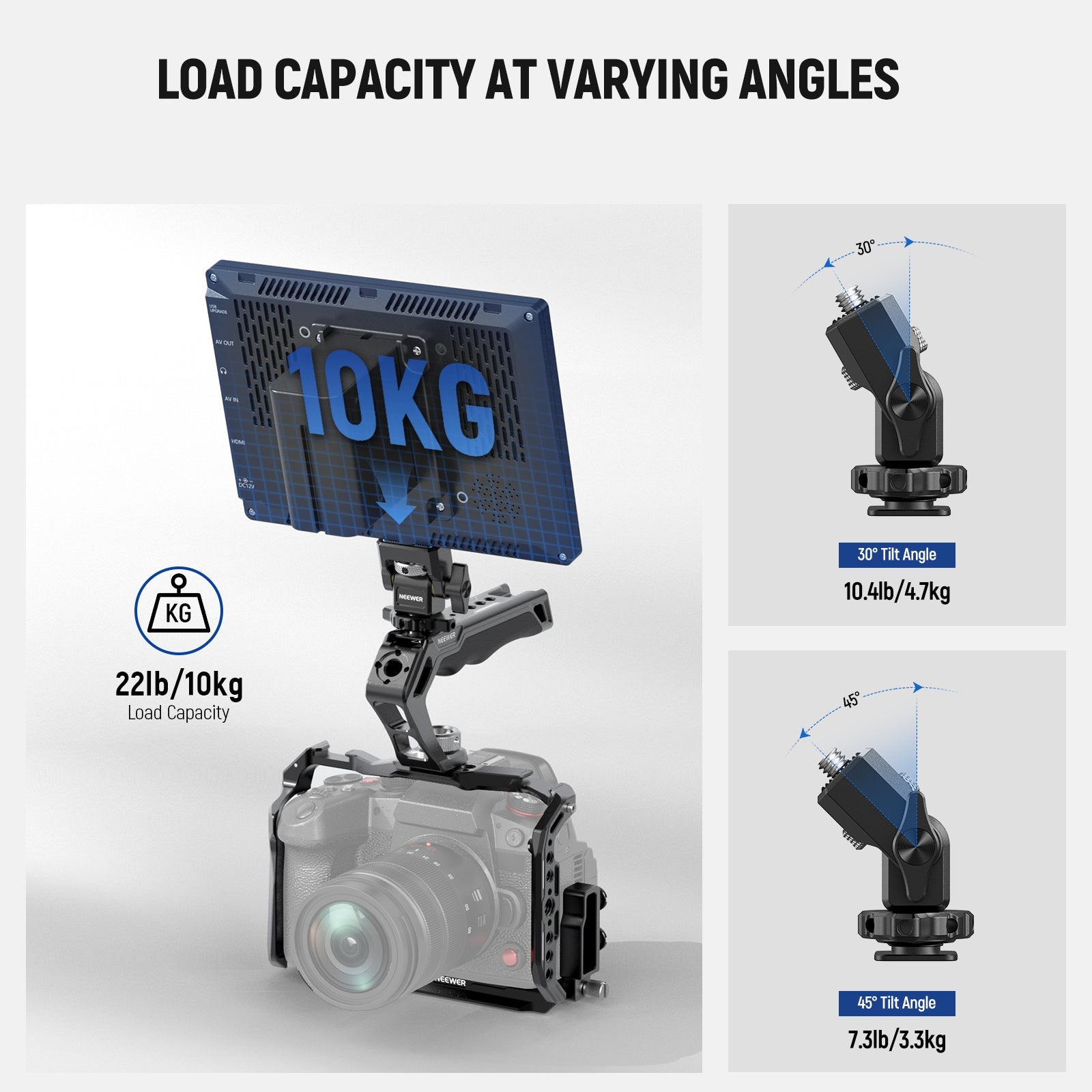 • Rotazione a 360° e inclinazione a 180° con smorzamento - Il supporto del monitor offre una rotazione a 360° e un'inclinazione a 180° con smorzamento per una regolazione precisa dell'angolazione in base al peso effettivo del monitor da campo. La capacità di carico varia in base agli angoli di inclinazione, che è di 10,4 libbre/4,7 kg a 30° e 7,3 libbre/3,3 kg a 45°, abbastanza alta per supportare un monitor della telecamera con sicurezza