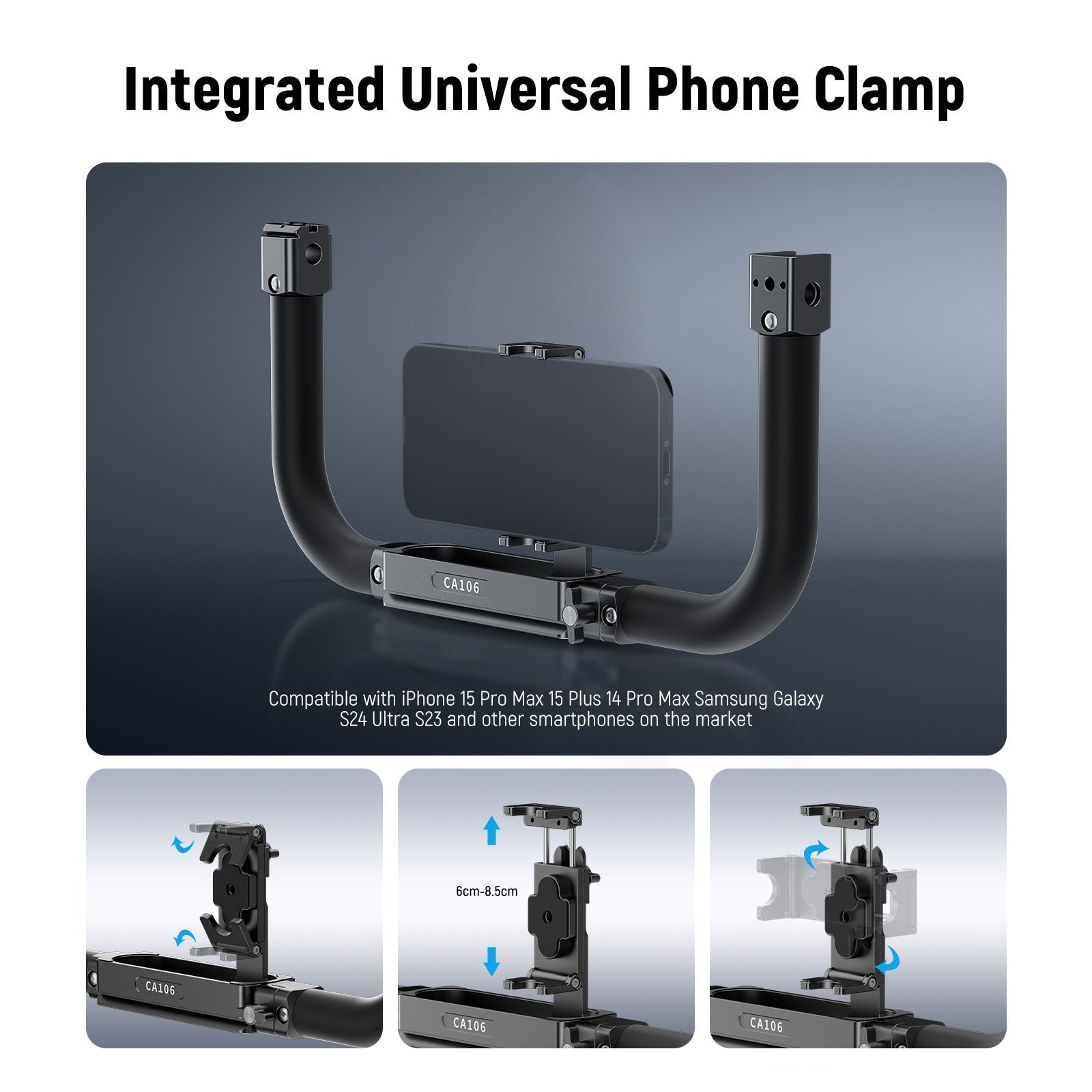 - Morsetto universale per telefono integrato : il morsetto per telefono regolabile da 60-85 mm è universalmente compatibile con iPhone 16 15 Pro Max 15 Plus 14 Pro Max Samsung Galaxy S24 Ultra S23 e altri smartphone. Anche le fotocamere mirrorless compatte e le videocamere vlog possono essere collegate a questo stabilizzatore