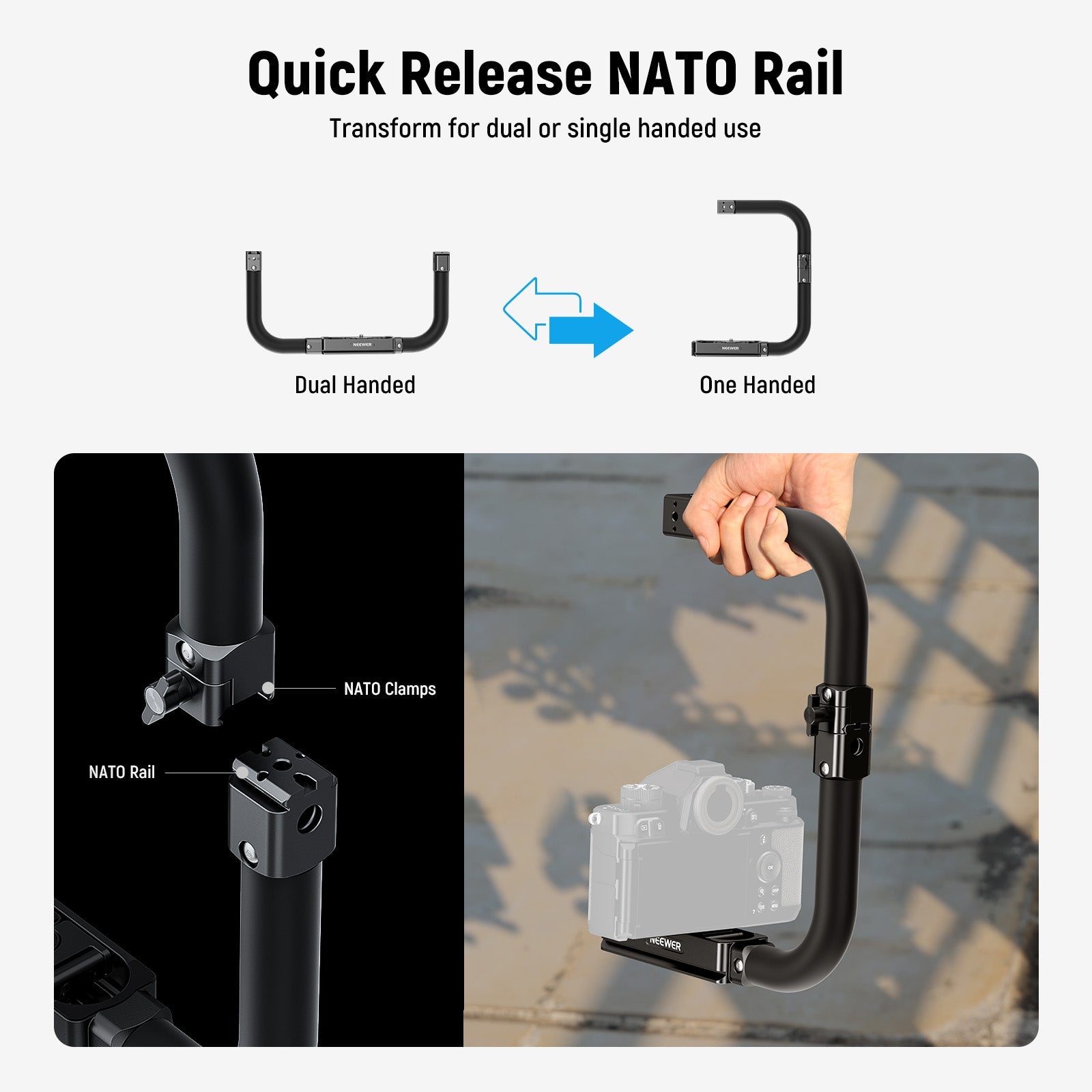 - Impugnature ergonomiche a forma di U : rivestite con schiuma morbida e antiscivolo, le impugnature a forma di U offrono una presa comoda e salda per riprese stabili a mano libera, come vlog, riprese cinematografiche, streaming live e altro ancora.