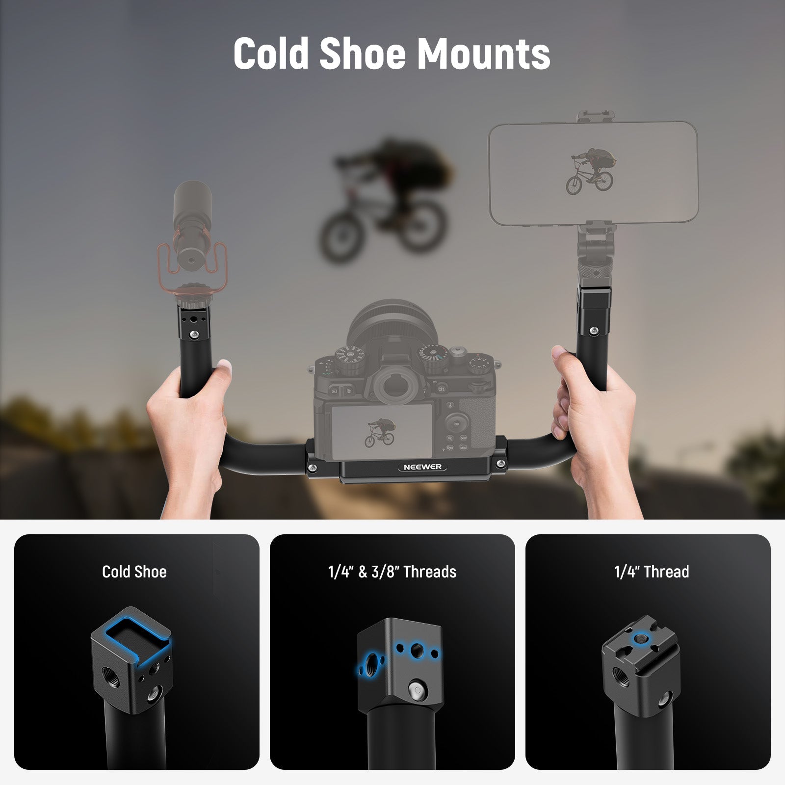 - Cold Shoe per il montaggio degli accessori - Progettato con diversi cold shoe, puoi collegare vari accessori, tra cui la luce video LED RGB62, il microfono CM14 Pro e altri, a questo stabilizzatore per telefono per una migliore qualità video