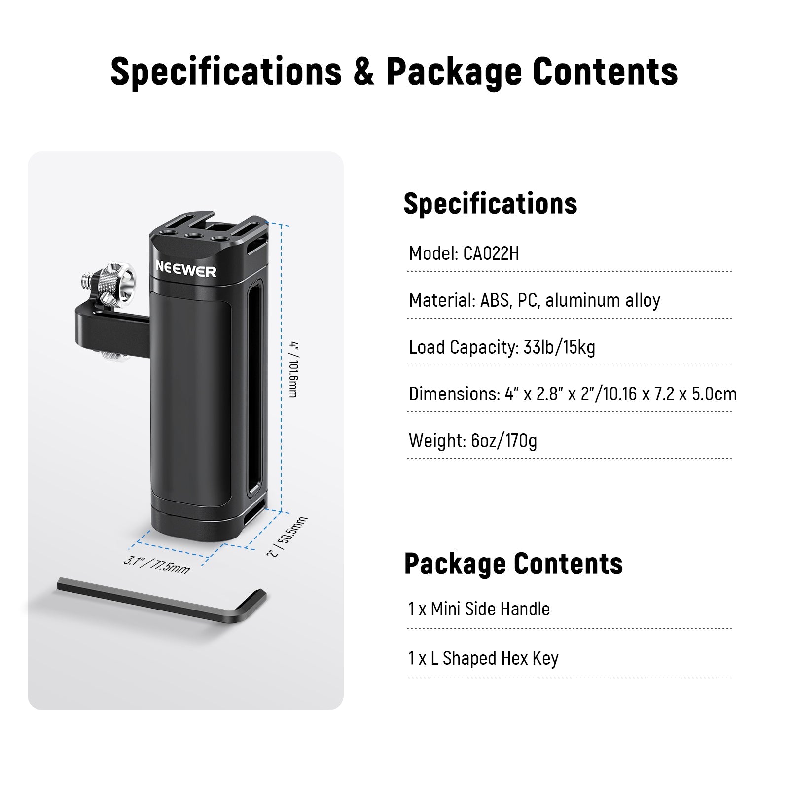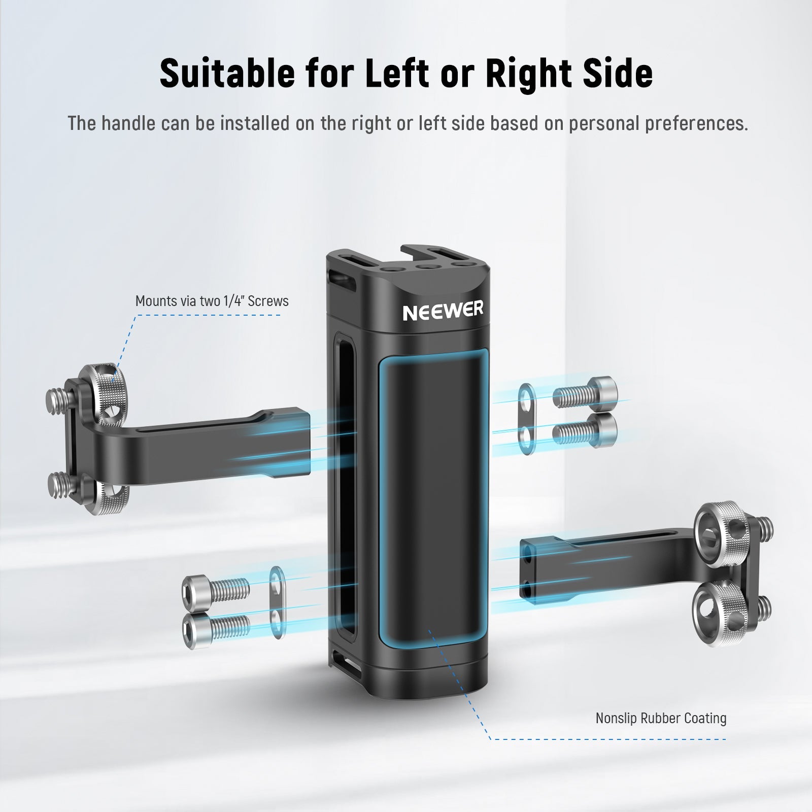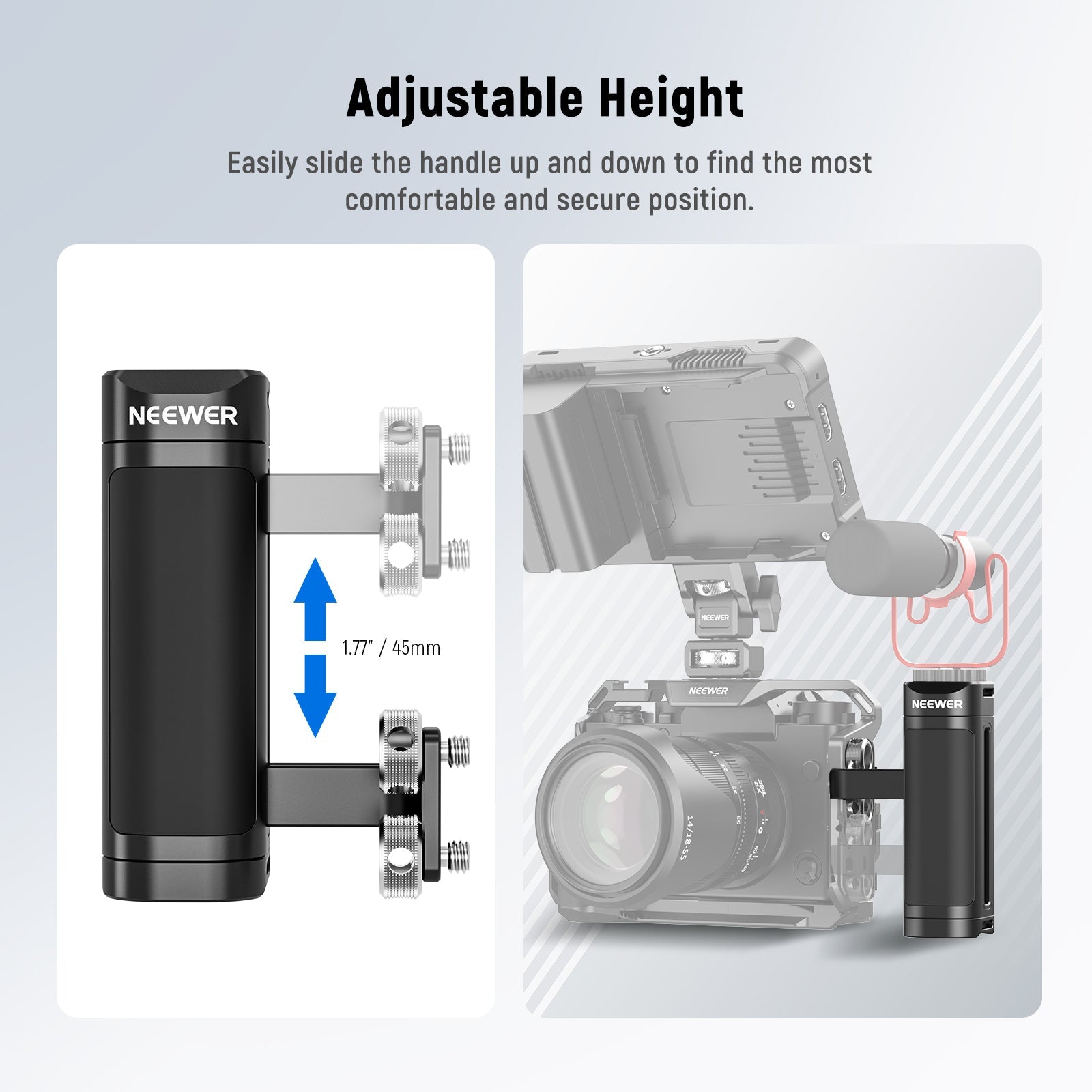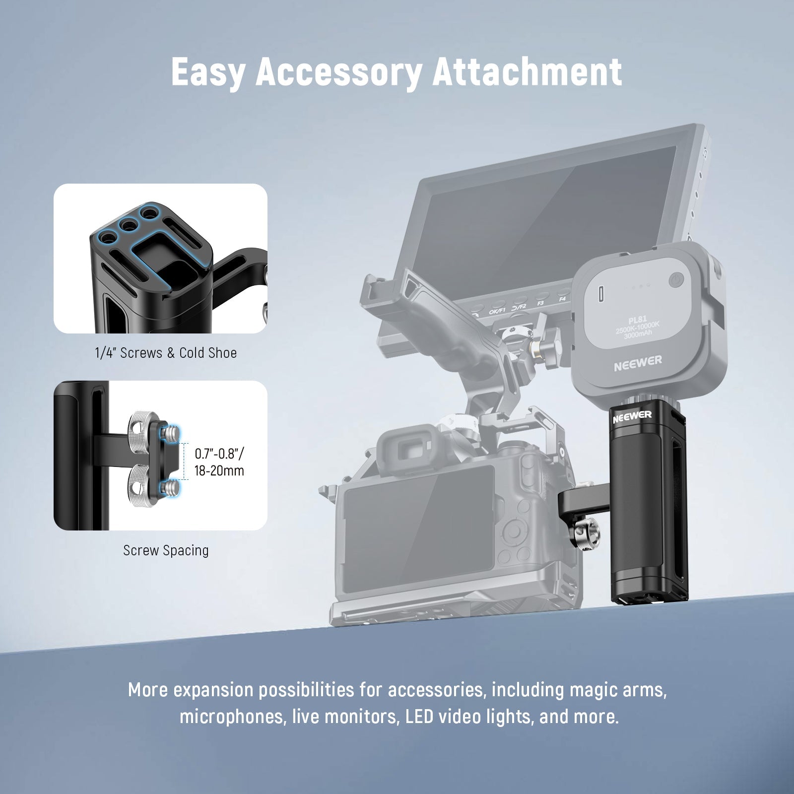 - Maniglia laterale universale ultraleggera : questa maniglia laterale compatta e leggera (170 g) si collega alla gabbia della fotocamera o all'impianto video tramite due viti a testa zigrinata da 1/4". Con spaziatura delle viti regolabile da 0,7" a 0,8" (18-20 mm), è compatibile con le gabbie SmallRig e numerose gabbie per fotocamera NEEWER (CA020 CA019 CA014 CA011 CA002) e ti aiuta a stabilizzare una fotocamera DSLR o mirrorless fino a 33 libbre (15 kg) (Non compatibile con Tilta)