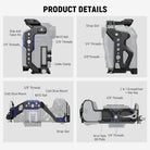 - Supporti multipli per accessori : filettatura da 1/4" per adattatore a doppia testa a sfera ST21, filettatura da 3/8" con fori di posizionamento per braccio magico UA010 e supporto per monitor MA004, scarpe fredde per accessori di registrazione video come microfono vlog CM14 PRO e luce LED PL81, NATO guide per maniglia superiore CA008 e impugnatura laterale CA017H con morsetti nato. Compatibile con le maniglie laterali superiori SmallRig. Le filettature da 1/4" e 3/8" consentono anche il montaggio del treppiede verticale e orizzontale