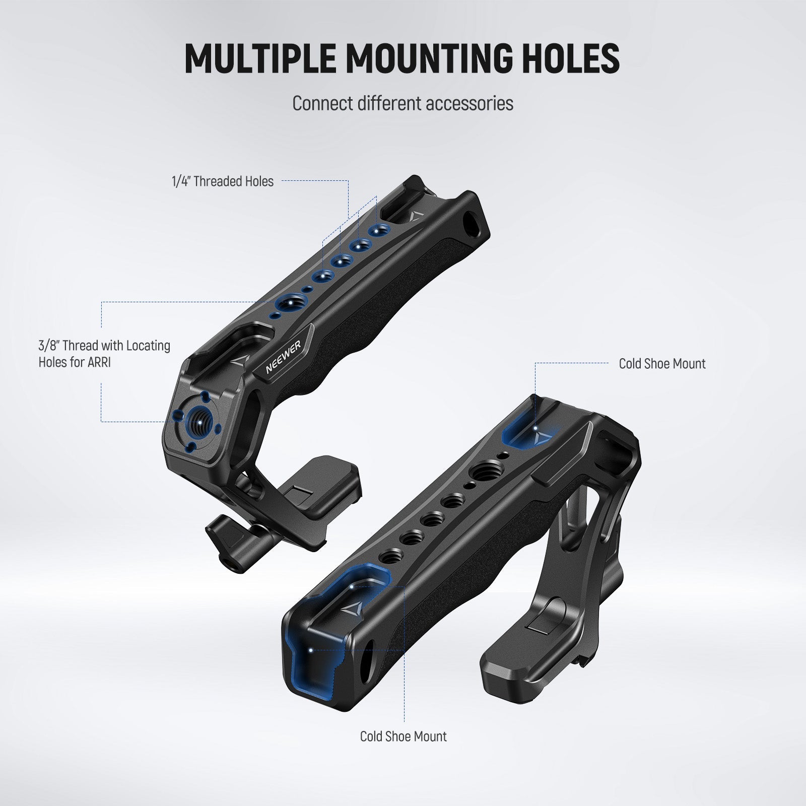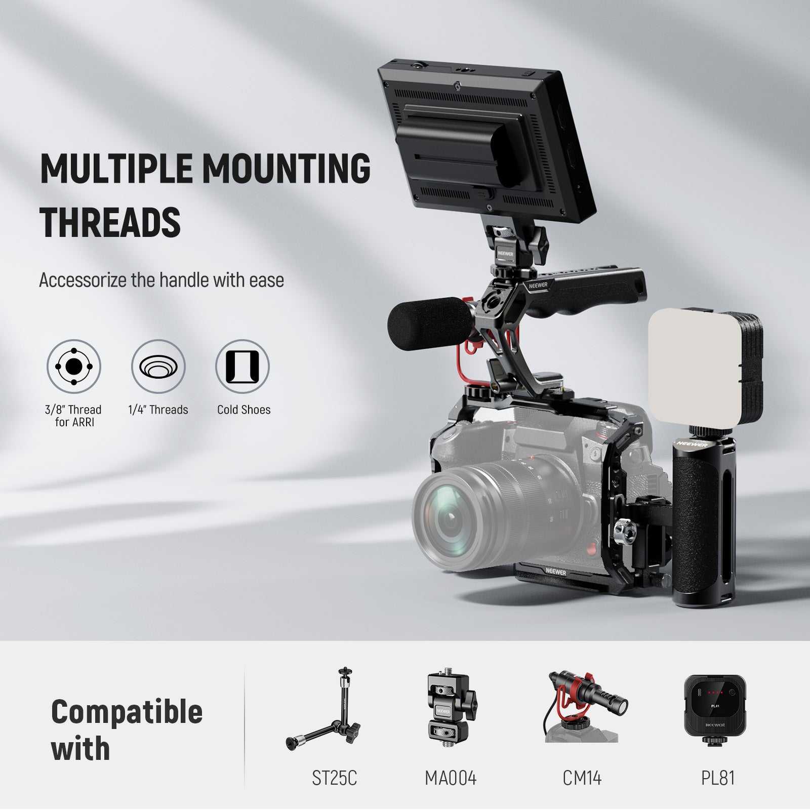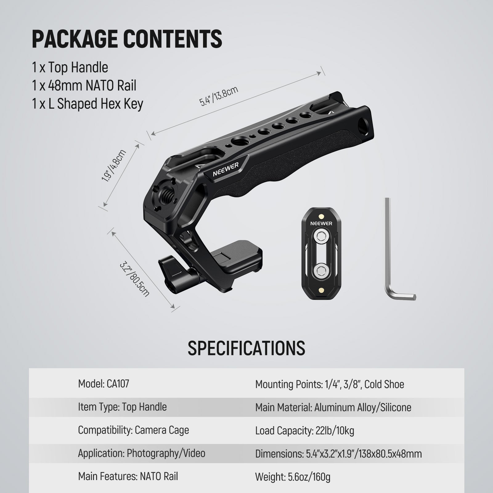 - Maniglia superiore con guida NATO - Questa maniglia superiore si fissa istantaneamente a qualsiasi gabbia per fotocamera dotata di guida NATO. Per rig e gabbie per fotocamera senza guida NATO integrata, è sufficiente installare la guida NATO esterna da 48 mm in dotazione per una compatibilità perfetta. Una chiave esagonale a L è inclusa per un'installazione rapida.
