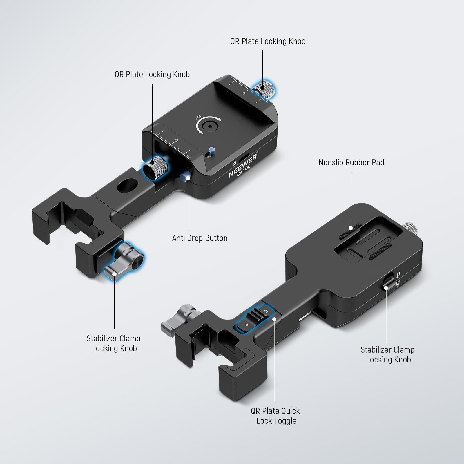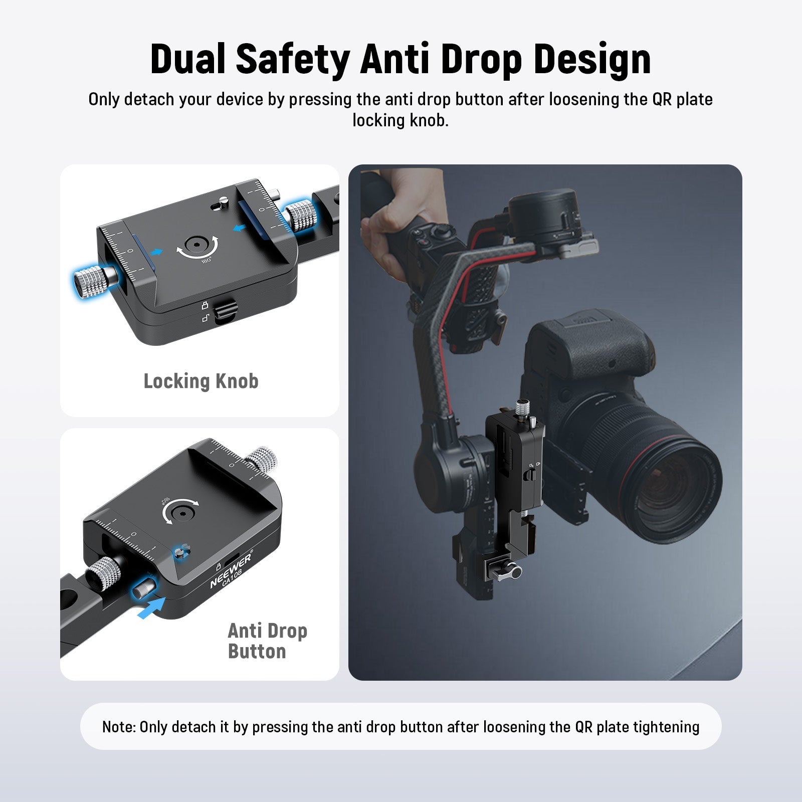 • Design anti-caduta con doppia sicurezza : fissa la tua fotocamera o altri dispositivi allo stabilizzatore con due manopole di serraggio per la piastra a sgancio rapido e il morsetto dello stabilizzatore, e un blocco a levetta per la base QR girevole a 180°. Il design con doppia sicurezza mantiene il tuo dispositivo al sicuro, poiché puoi staccarlo solo premendo il pulsante anti-caduta dopo aver allentato la manopola di serraggio della piastra QR