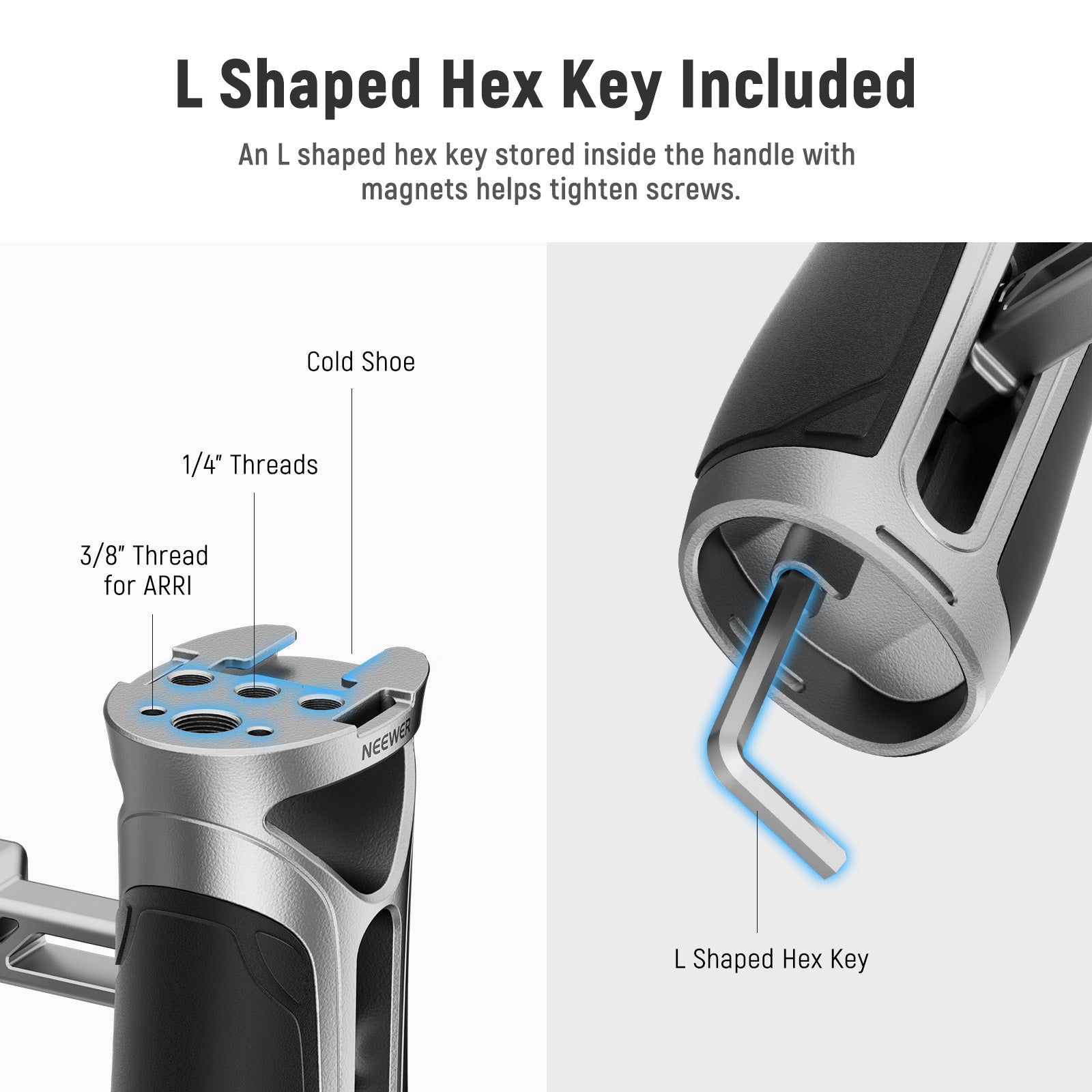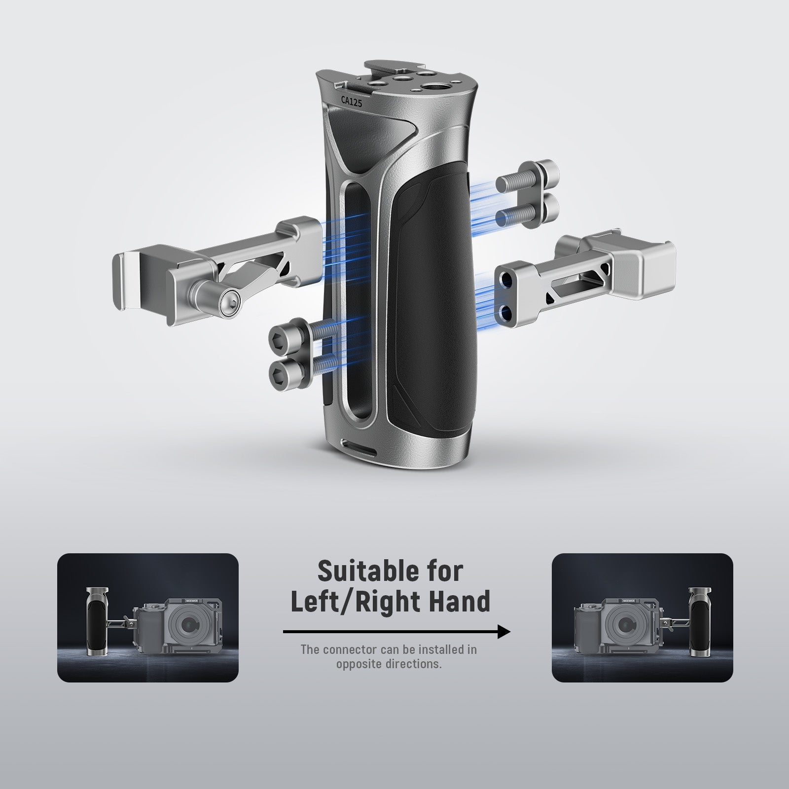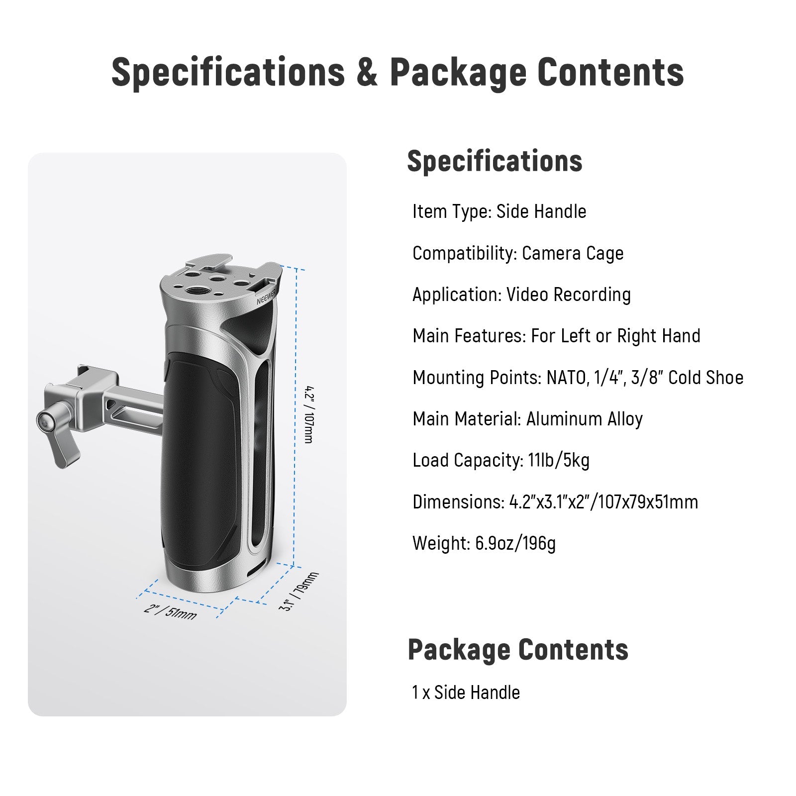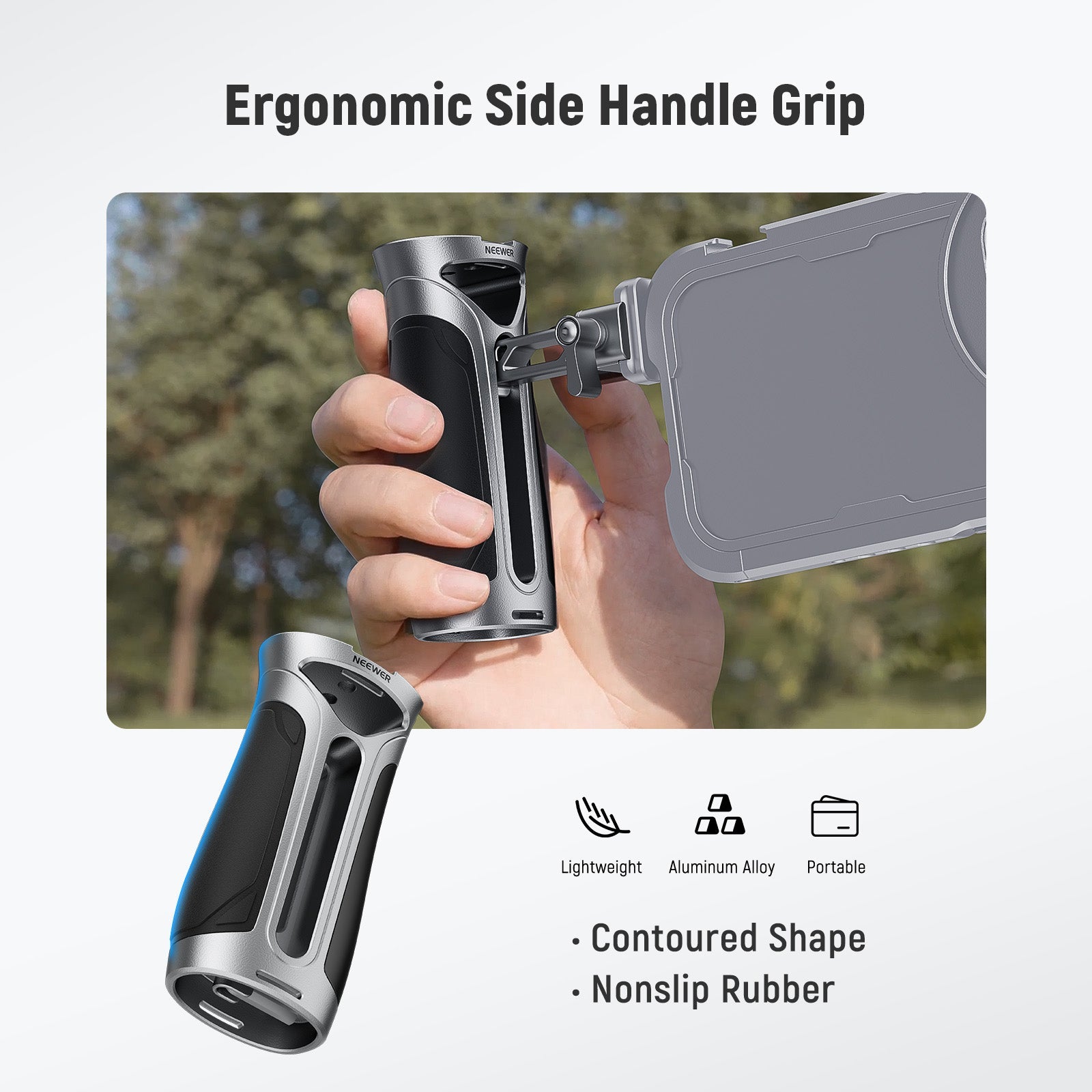 - Impugnatura laterale ergonomica - Questa elegante impugnatura laterale NATO offre una presa comoda e salda per le riprese a mano. Leggera e portatile, è ideale per l'uso all'aperto senza appesantirti