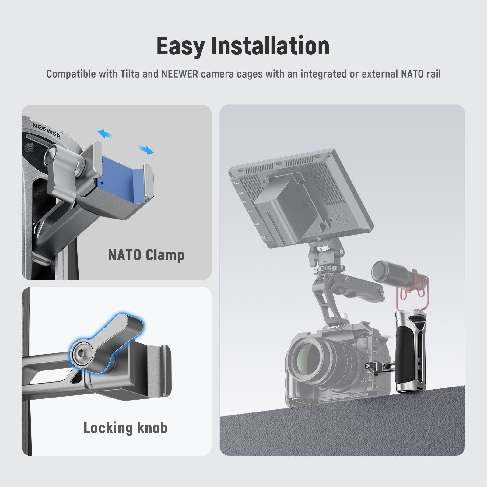 - Morsetto NATO a sgancio rapido - Il morsetto NATO può essere fissato in modo rapido e sicuro a una gabbia per telecamera NEEWER con binari NATO integrati o esterni. Compatibile anche con le gabbie per telecamera SmallRig; compatibile con le gabbie per telecamera Tilta