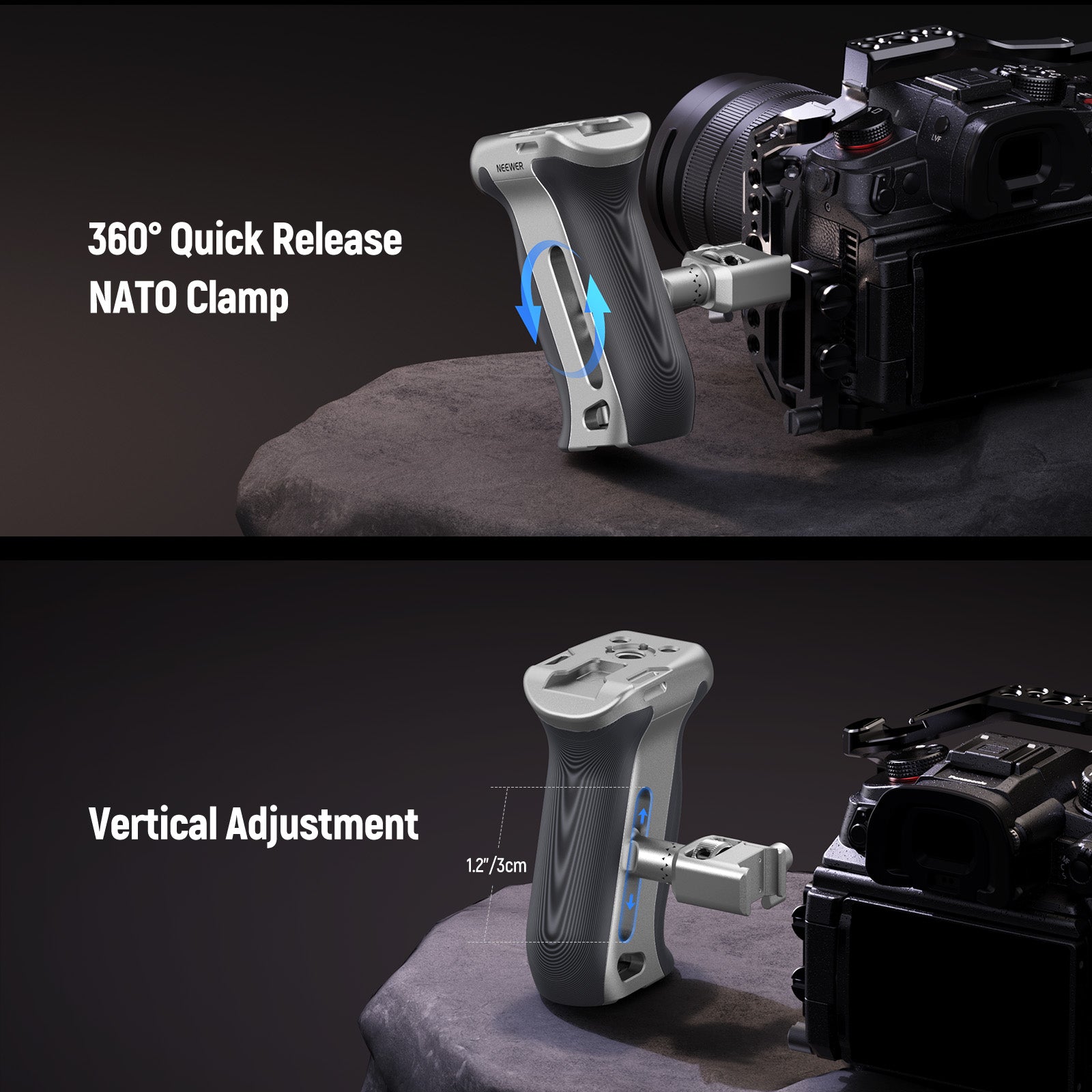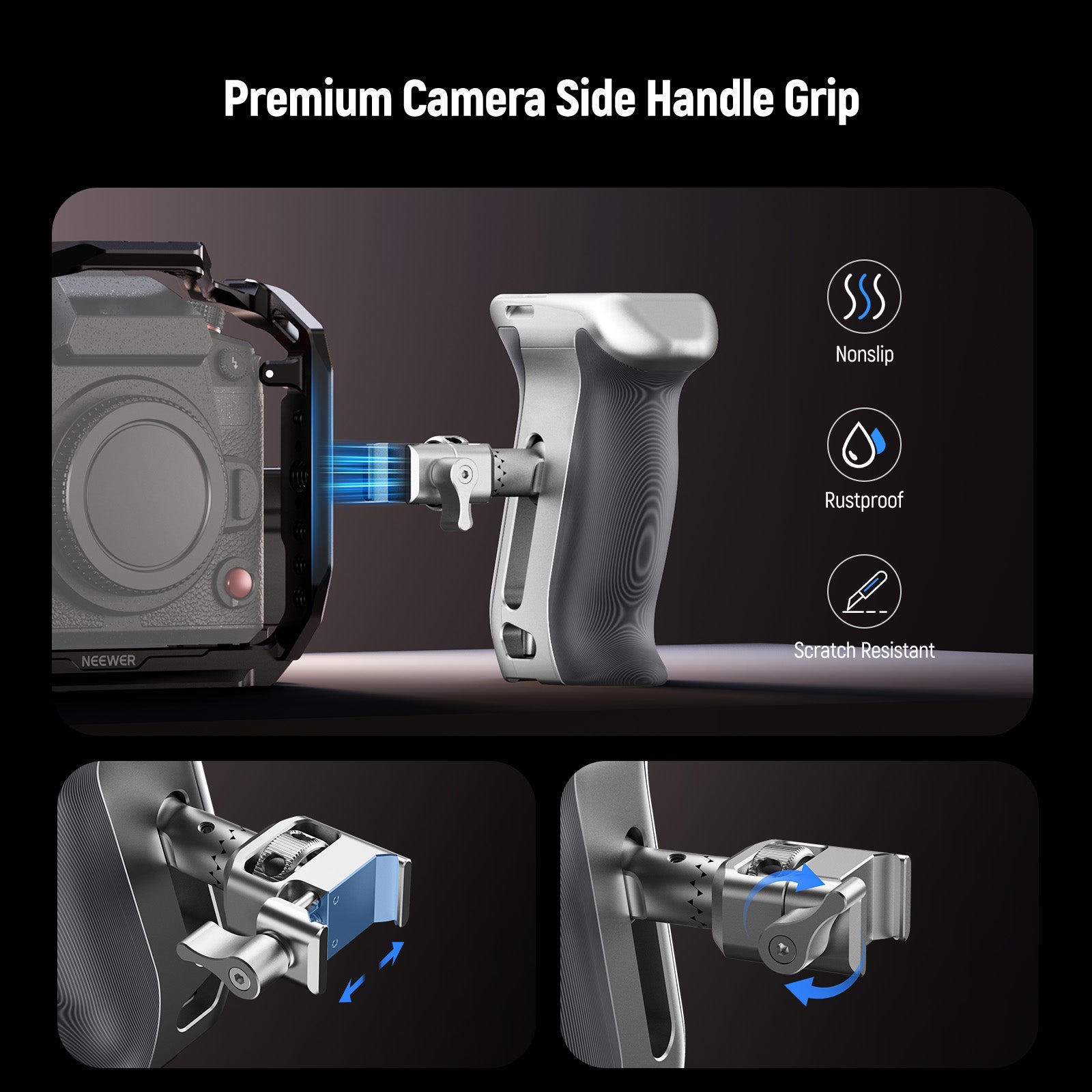 - Impugnatura laterale per fotocamera di alta qualità : realizzata in materiale ibrido di alta qualità, questa impugnatura laterale offre una durata eccezionale, una resistenza affidabile alla ruggine e ai graffi e una presa antiscivolo per riprese a mano libera comode e stabili.