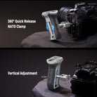 - Morsetto NATO a sgancio rapido a 360° - Il morsetto NATO a sgancio rapido si aggancia senza problemi a qualsiasi gabbia per telecamera con binari NATO integrati o esterni. Supporta anche la rotazione a 360° e funge anche da maniglia superiore per scatti dal basso