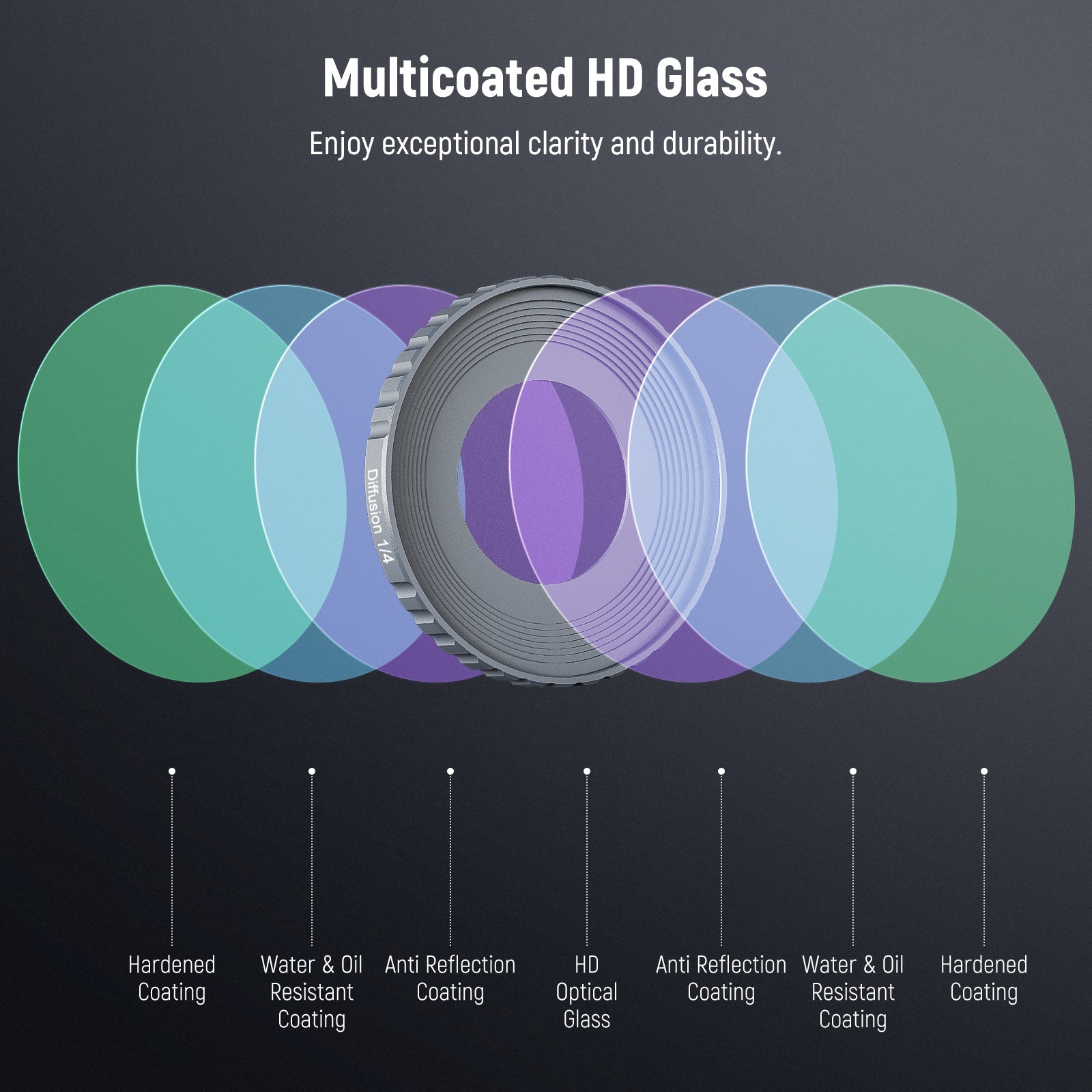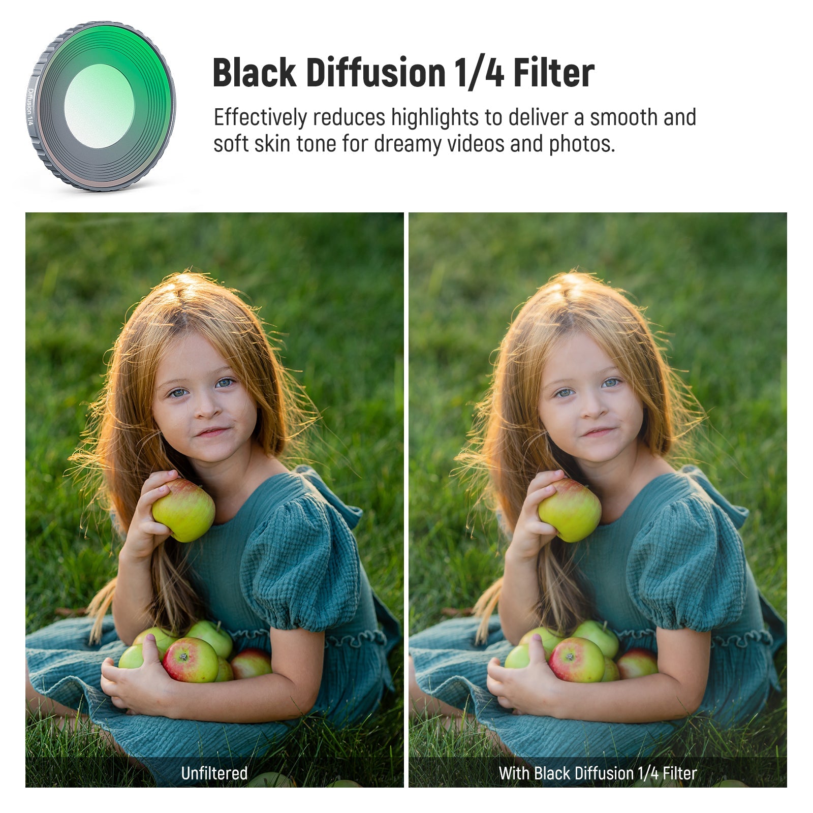 - Effetto cinematografico morbido e sognante : il filtro di diffusione nero da 1/4 può levigare la grana della pelle, diffondere le alte luci e aggiungere un effetto sognante ai tuoi scatti, perfetto per ritratti, selfie e vlog personali.