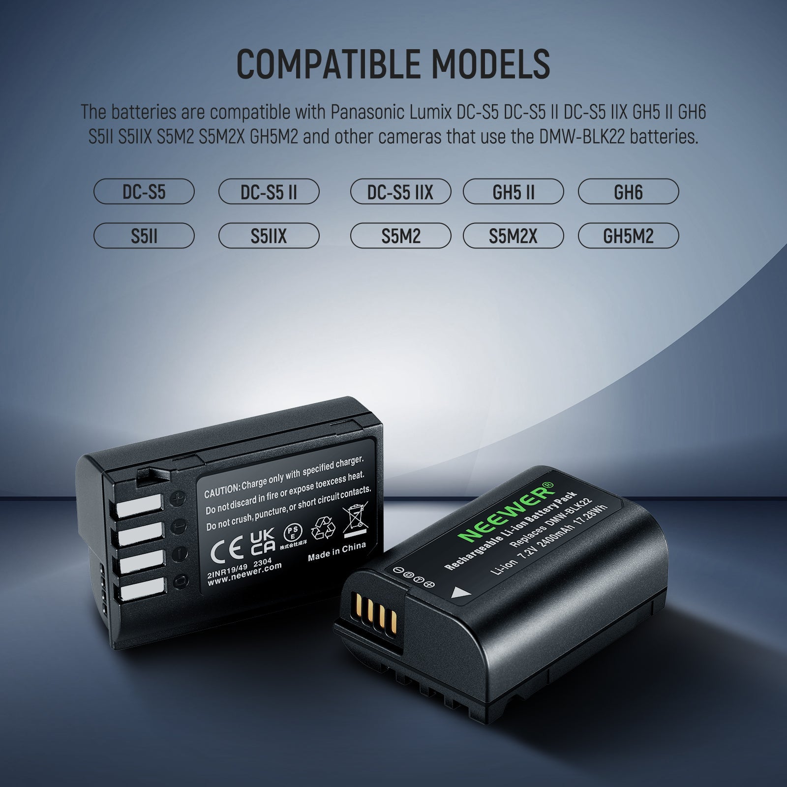 • Compatibilità perfetta : le batterie sono compatibili con Panasonic Lumix DC-S5 DC-S5 II DC-S5 IIX GH5 II GH6 S5II S5IIX S5M2 S5M2X GH5M2 e altre fotocamere che utilizzano batterie DMW-BLK22. Le batterie e il caricabatterie sono compatibili anche con caricabatterie e batterie originali Panasonic