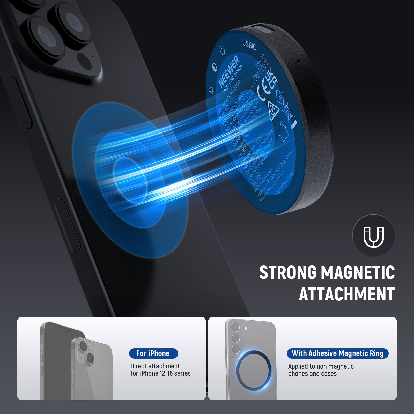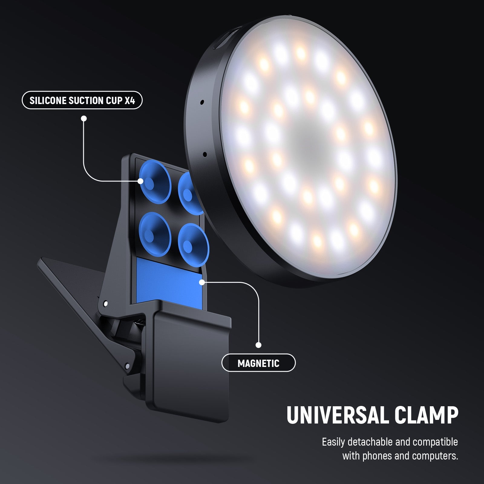 • Magnetic Selfie Light with Clamp- The mini fill ringlight as photography accessories is compatible with MagSafe iPhone 16 Pro Max Plus 15/14/13/12 iPad Pro and other magnetic devices. For nonmagnetic devices, use the included adhesive magnetic clip or mounting clip to mount it on Android phone for overhead filming recording or desk laptop for video calls, compatible with Samsung Galaxy S25 S24 S23 Ultra, etc. The clip allows dual direction mounting for both front and rear camera fill lighting