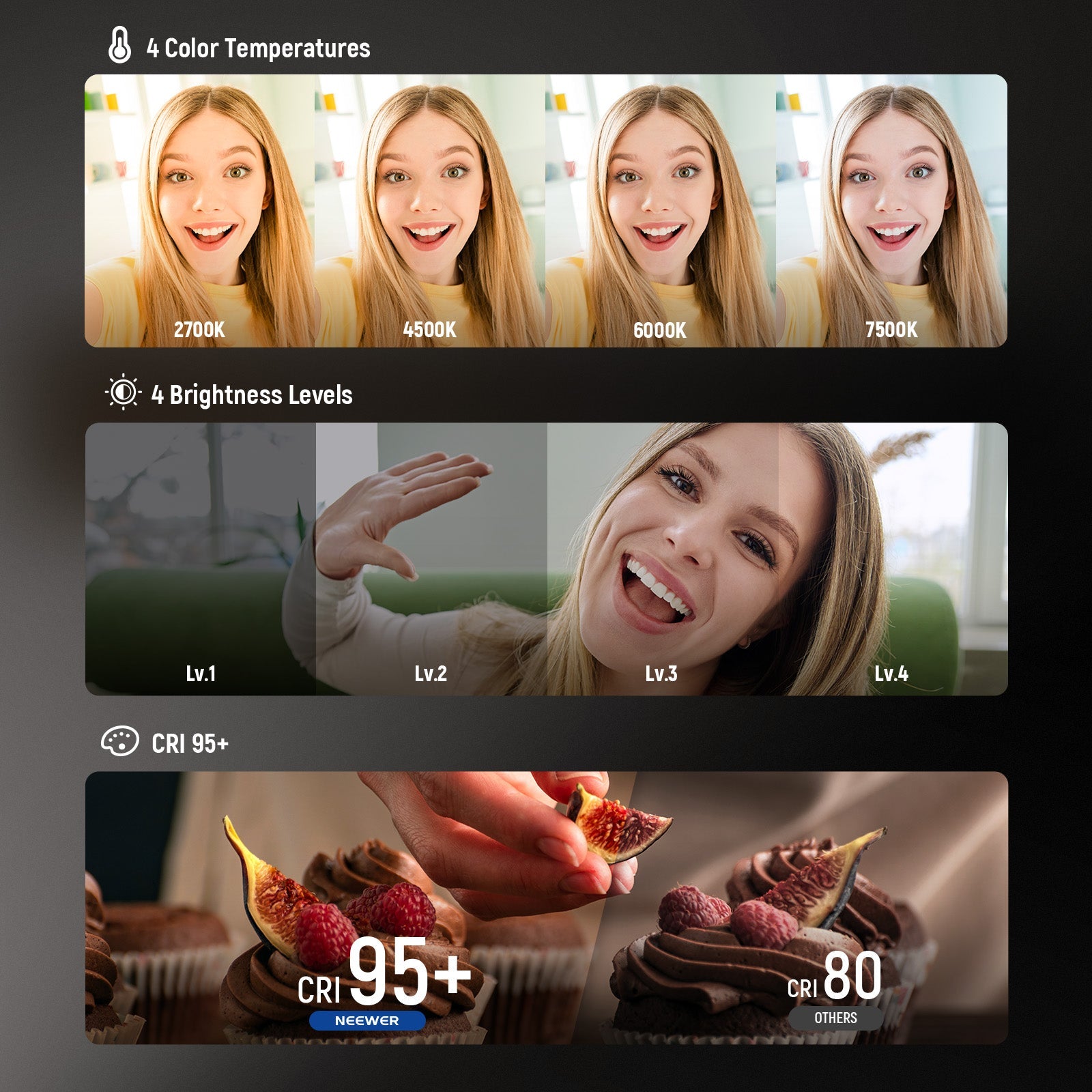- 4 CCT Settings & 4 Brightness Levels- The LED fill ring soft light offers 4 adjustable color temperatures (2700K, 4500K, 6000K, 7500K), each with 4 brightness levels. Ideal for YouTube/Ins social media vlogs recording, selfies, podcast, makeup artists streamer TikTok live streaming, table laptop video conferencing, professional Zoom meeting webcam lighting for desktop computer monitor, as content creator essential and influencer must have. Different modes switched through the physical buttons