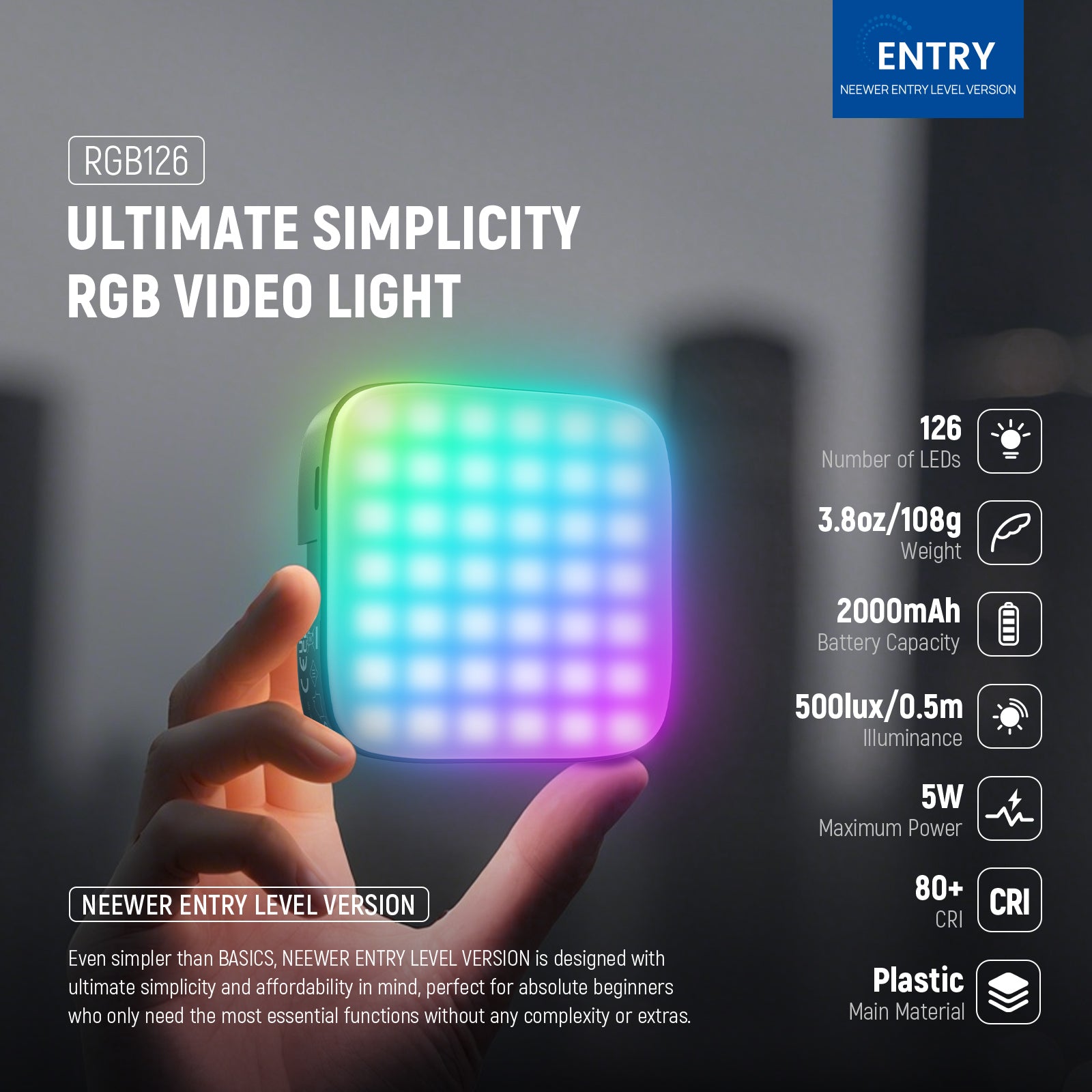 • Introducing NEEWER ENTRY LEVEL VERSION- Even simpler than BASICS, NEEWER ENTRY LEVEL VERSION is designed with ultimate simplicity and affordability in mind, perfect for absolute beginners who only need the most essential functions without any complexity or extras. Note: When used while charging, the RGB126's power automatically drops to 3.5W