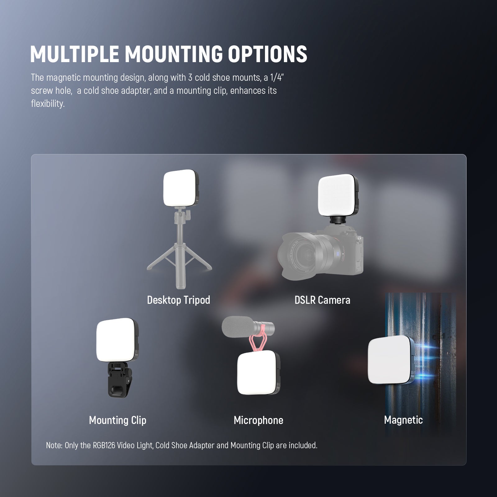 • Multiple Mounting Options- Attach it to any magnetic metal surface via the built in magnets on the back. Or mount it on light stands, tabletop tripods, or cameras via the 1/4" screw hole and the cold shoe adapter. The three additional cold shoe mounts on the edges provide options for connecting camera or photography videography accessories like microphones and LED lights. Also includes a mounting clip for attaching to a phone, laptop, and PC for video conferencing, zoom calls, etc
