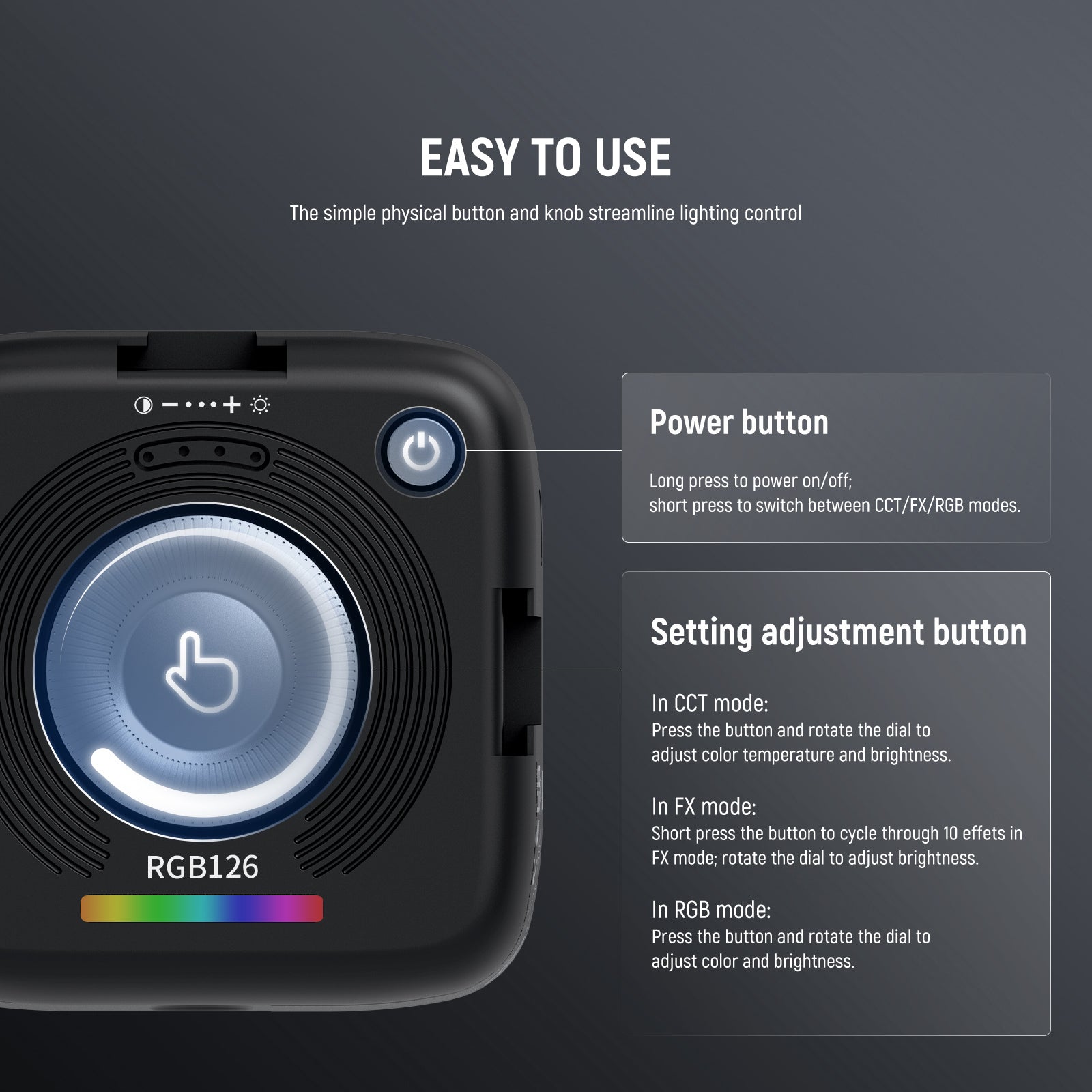 • Compact & Portable Camera Light- The RGB126 is a pocket sized mini LED fill cube panel light for cameras photography, measuring 3"x3"x1.4"/76x76x35mm, weighing only 3.8oz/108g with the diffuser. Also can be clamped on a laptop, or magnetically attached to capture beautiful moments as a key or fill light. The simple physical button and knob streamline lighting control, essential gear and must have selfie light for social media content creators, makeup artists, live streamers, and influencers