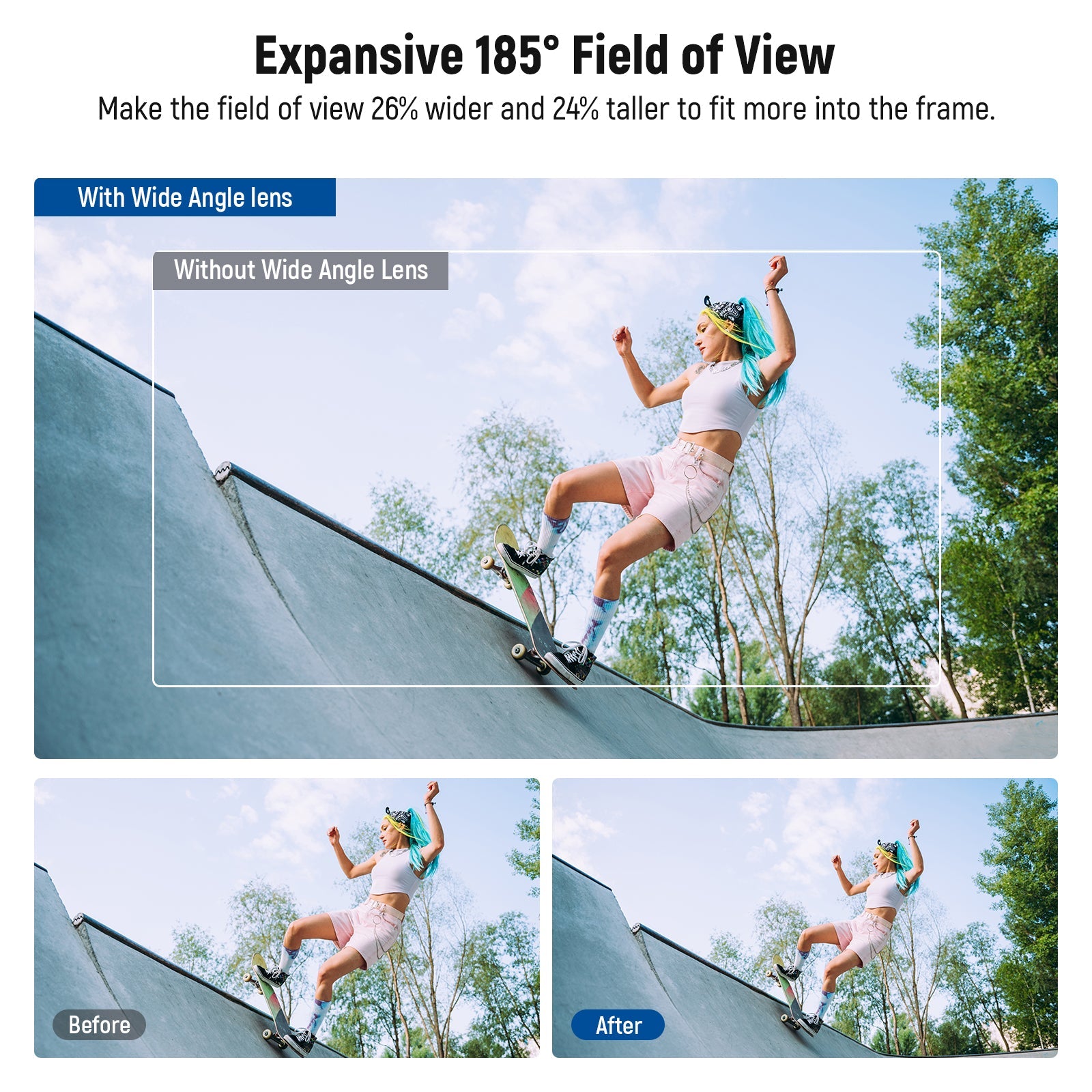 - Obiettivo grandangolare con campo visivo di 185° - L'obiettivo grandangolare espande il campo visivo (FOV) a 185° e crea un effetto leggermente distorto per scatti creativi, perfetto per paesaggi, street photography e ritratti di gruppo. La sua struttura asferica ad alta trasmissività offre una nitidezza eccezionale.