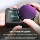- Controllo dell'esposizione facile e preciso : il filtro a densità neutra variabile ND8-32 per obiettivi action camera riduce la luce di 3-5 stop per un controllo flessibile dell'esposizione. Ruotare la cornice esterna nelle posizioni contrassegnate per una regolazione precisa e un effetto motion blur creativo. Nota: una leggera vignettatura potrebbe apparire con l'impostazione ND più alta in modalità ultra grandangolare. Questa è una normale caratteristica ottica e non influisce sulla qualità complessiva dell'immagine.
