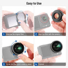 - Per Action 5 Pro e Action 4 - Compatibile con DJI Osmo Action 5 Pro e Action 4 Adventure Combo, questo set 4 in 1 include 3 filtri e un obiettivo per surf, kayak, sci, mountain bike, paracadutismo, skateboard, escursionismo e altri sport. Basta rimuovere l'obiettivo originale e avvitarlo per un'installazione rapida e sicura. Nota: i filtri e l'obiettivo non sono sigillati contro le intemperie e non sono adatti all'uso subacqueo, poiché l'acqua potrebbe penetrarvi e compromettere la qualità dell'immagine.