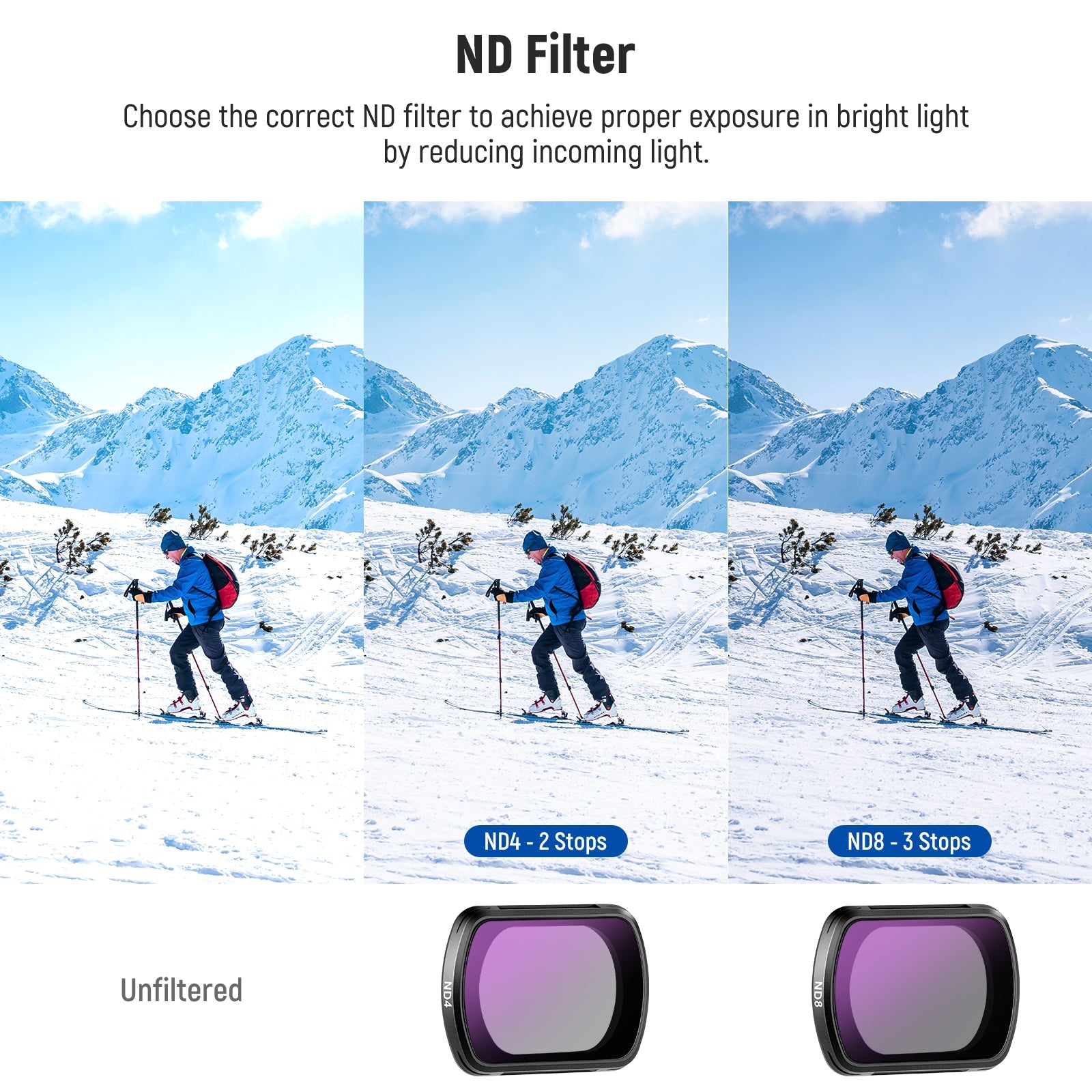 - Bilanciamento dell'esposizione facile e preciso : i filtri ND4 e ND8 riducono la luce rispettivamente di 2 e 3 stop. Ideali per la fotografia a lunga esposizione in giornate luminose, consentono di scattare a velocità di otturazione più lente con aperture più grandi e di catturare soggetti in movimento con effetti di sfocatura cinematografica
