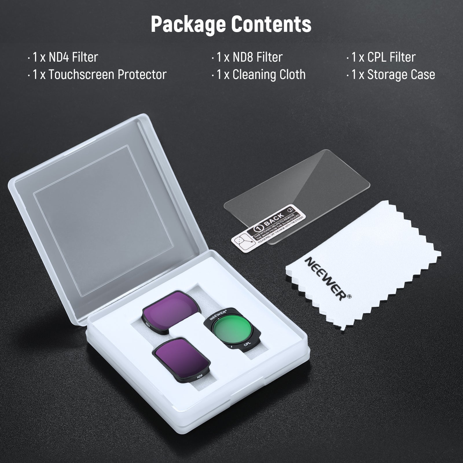 - Rivestimenti nanometrici multistrato - Rivestimenti nanometrici multipli su entrambi i lati resistono ad acqua, olio, polvere, graffi e impronte digitali per un'elevata durata durante le riprese all'aperto e riflessi minimi. Facile da pulire con il panno di pulizia incluso