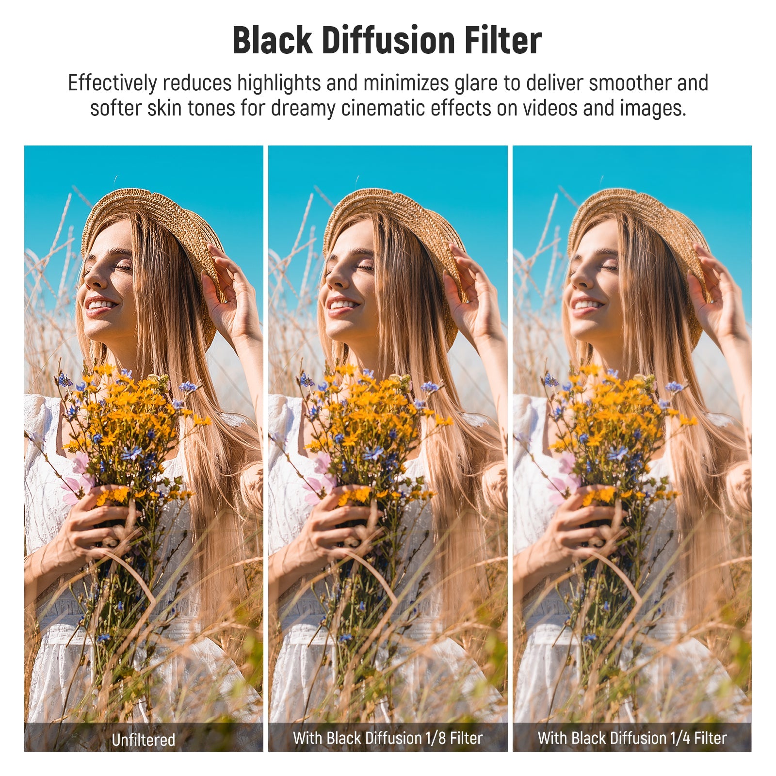 - Vibrazione cinematografica morbida e sognante : il filtro di diffusione nero da 1/4 e 1/8 può levigare la grana della pelle aggiungendo un effetto sognante e nebuloso ai tuoi scatti, perfetto per ritratti, selfie, scene ricche di azione e vlog personali come accessori fotografici essenziali e indispensabili per le attrezzature per fotocamere gimbal di creatori di contenuti/influencer