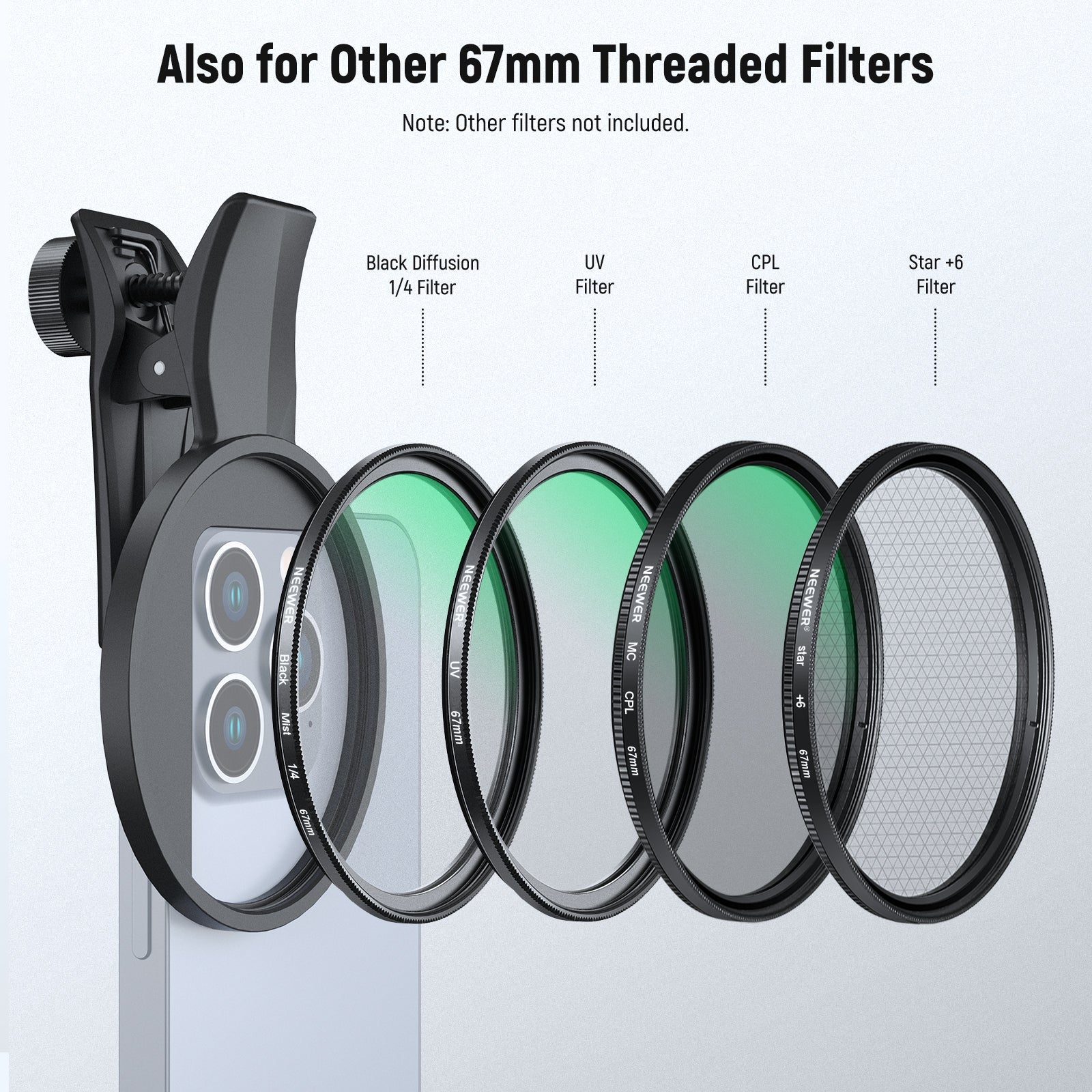 - Kit versatile di filtri per telefono - Il kit di filtri clip-on NEEWER da 67 mm eleva la tua attrezzatura fotografica mobile al livello di una reflex digitale, diventando un elemento essenziale per i creatori di contenuti e gli influencer. Ideale per viaggi, fotografia di strada, fotografia paesaggistica e time-lapse, così come per matrimoni e social media. Include una custodia compatta e portatile per un facile trasporto e conservazione, perfetta per gli accessori del cellulare in movimento.