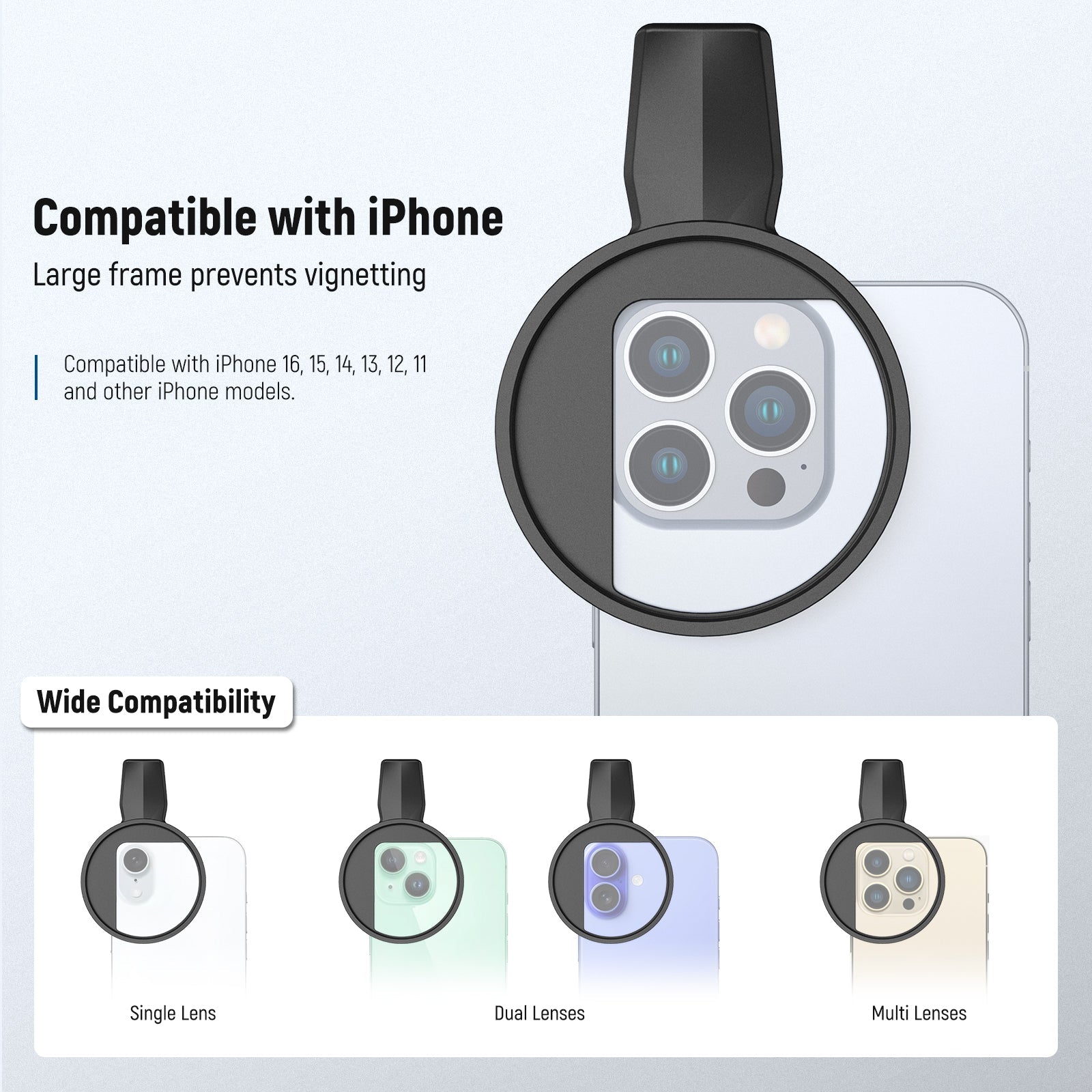 Ampia compatibilità : la clip per filtro per telefono è compatibile con iPhone 17, 16 Pro Max, 16 Plus, 16e, 15 Pro Max, 15 Plus, 14, 13 mini, 12, 11 X e altri modelli di iPhone. Funziona con qualsiasi filtro da 67 mm, inclusi CPL, ND, UV, luce stellare, diffusione nera, GND e lenti con effetto striato blu/oro.