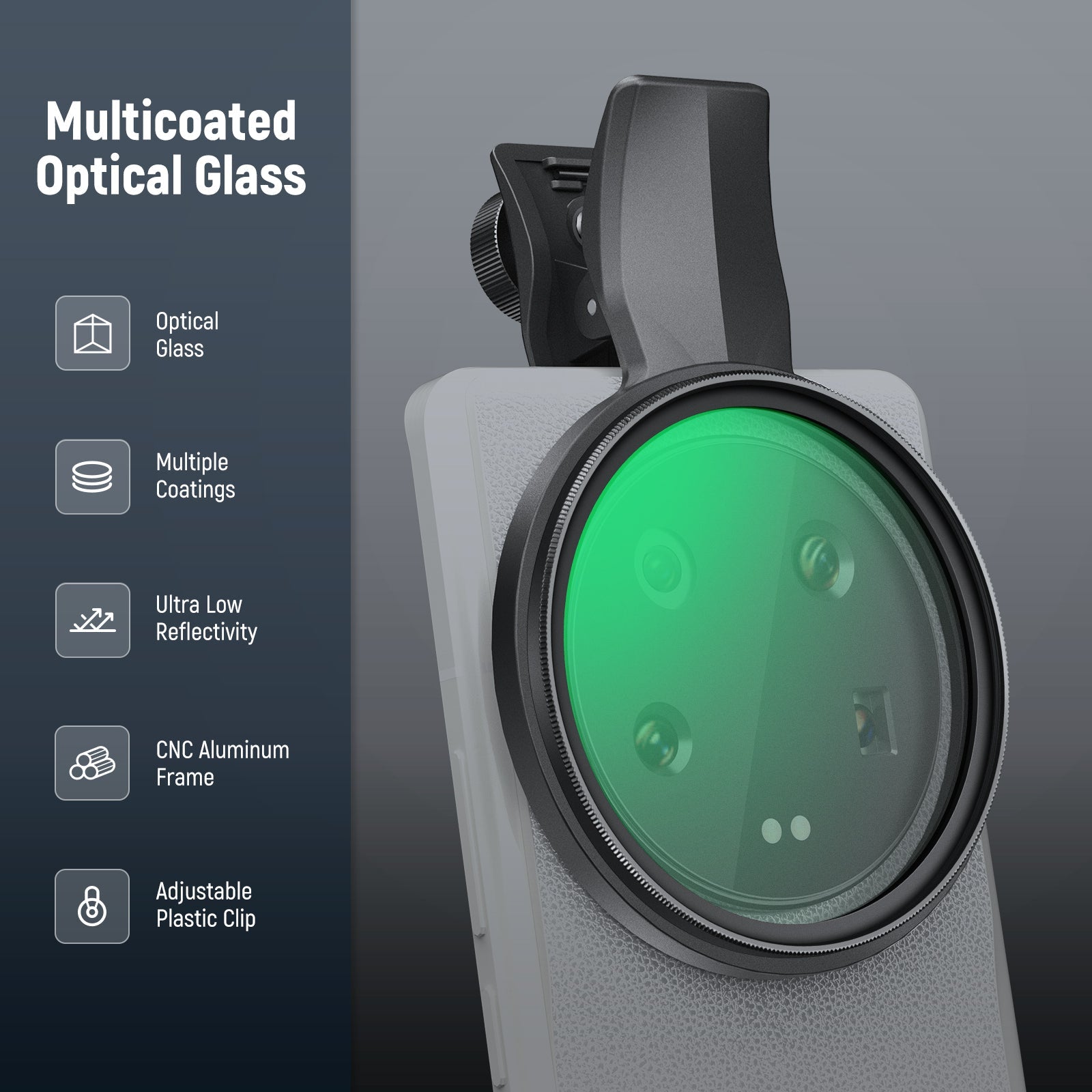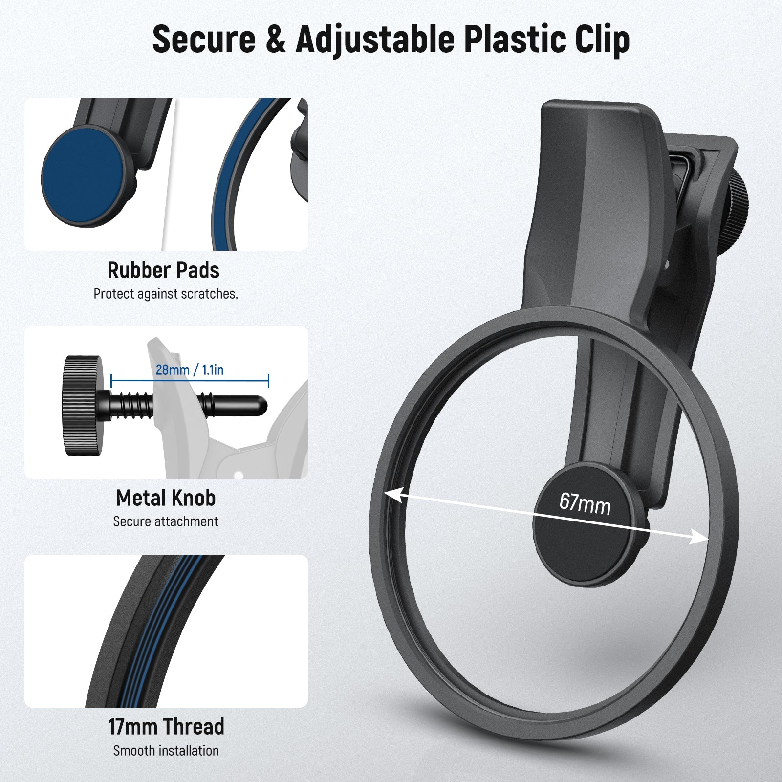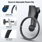 - Clip sicura e regolabile : la clip del filtro è dotata di una vite regolabile che consente di personalizzare l'apertura della clip e di fissarla saldamente durante l'uso. I cuscinetti in gomma morbidi e antiscivolo aggiungono ulteriore stabilità e proteggono il telefono dai graffi.