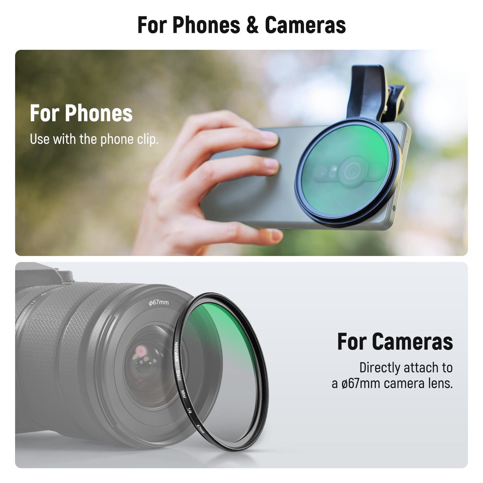 - Kit di filtri per telefono versatile : il kit di filtri clip-on NEEWER da 67 mm eleva la tua attrezzatura fotografica mobile ai livelli di una reflex digitale, diventando un elemento essenziale per i creatori di contenuti e per gli influencer. Ideale per viaggi, fotografia di strada, paesaggistica e time-lapse, così come per matrimoni e social media. Include una custodia compatta e portatile per un facile trasporto e conservazione, perfetta per gli accessori del cellulare in movimento.