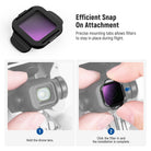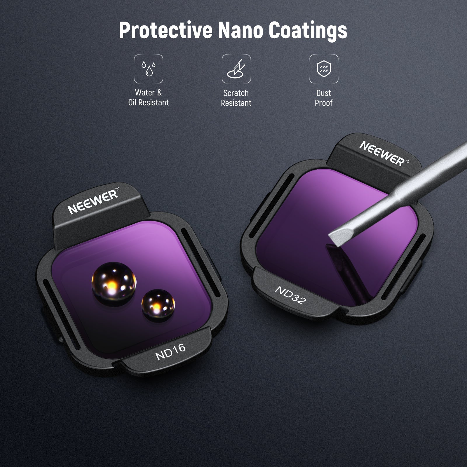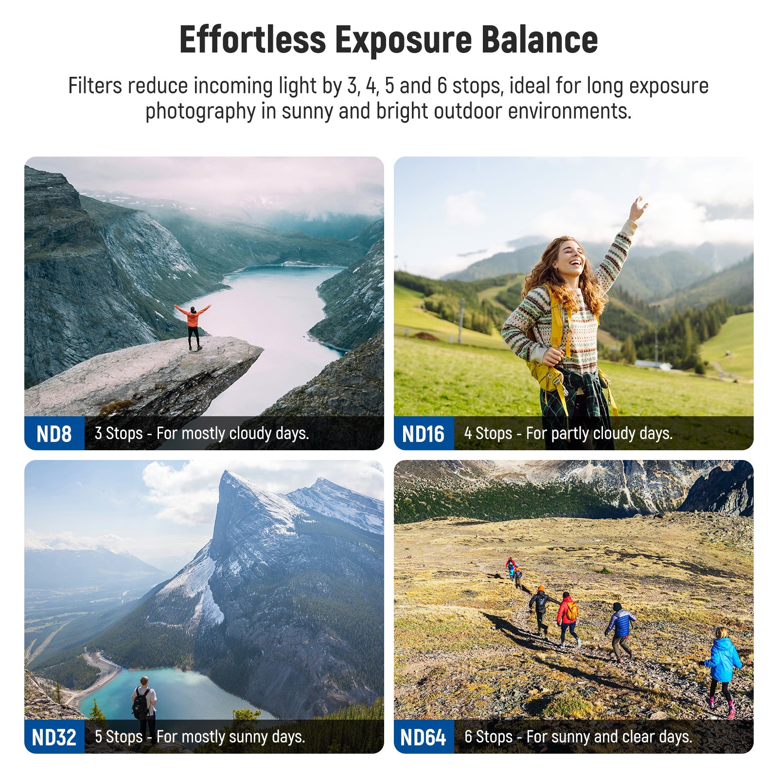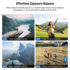 - Bilanciamento dell'esposizione senza sforzo : i filtri ND8, ND16, ND32 e ND64 riducono la luce rispettivamente di 3, 4, 5 e 6 stop, adatti per la fotografia a lunga esposizione in condizioni luminose all'aperto. Consentono di scattare a velocità di otturazione più lente con aperture più grandi e di catturare i movimenti con effetti di sfocatura del movimento espressivi
