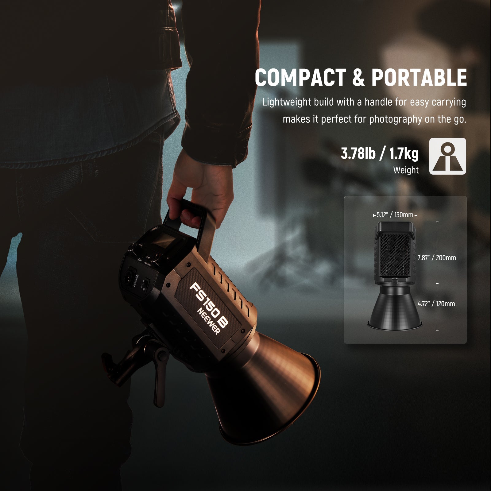 - Potente luce video compatta da 130 W - NEEWER FS150B utilizza LED COB premium ed altamente efficienti per una luminosità eccezionale, un'uscita da 130 W senza sfarfallio e un illuminamento massimo di 72000 lux a 1 m. Il faretto portatile pesa solo 1,7 kg (3,8 libbre) e misura 200 x 130 x 120 mm (7,9 x 5,1 x 4,7 pollici), con un adattatore per montaggio su supporto inclinabile a 180° per configurazioni ad angolo libero: ideale per ritratti, interviste, video YouTube/TikTok registrazione, riprese, live streaming e produzione in studio