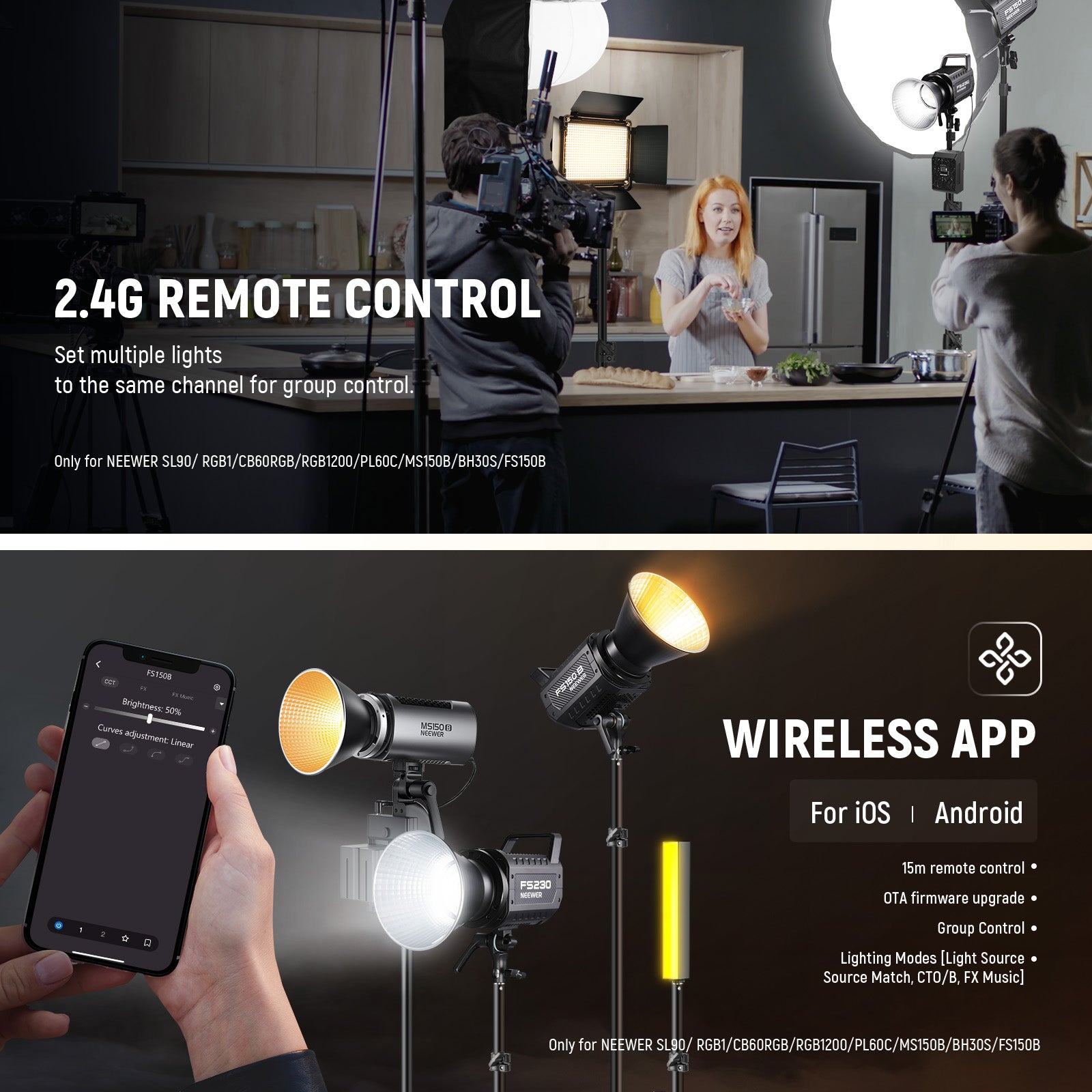 - App Infinity e controllo wireless 2.4G - L'APP NEEWER supporta il controllo di gruppo e gli aggiornamenti firmware OTA. Fornisce inoltre Light Source, FX Music e altre funzioni per il controllo avanzato dell'illuminazione. Il sistema 2.4G integrato supporta il controllo di gruppo di diversi modelli (SL90 Pro, RGB1, RGB C80, RGB 1200, MS60C, MC60B, MS150B, BH30S, FS150B, CB200B e CB60B) nei canali 00-99. Quando tutte le luci sono impostate sullo stesso canale, l'impostazione di 1 luce può far cambiare le altre in tandem