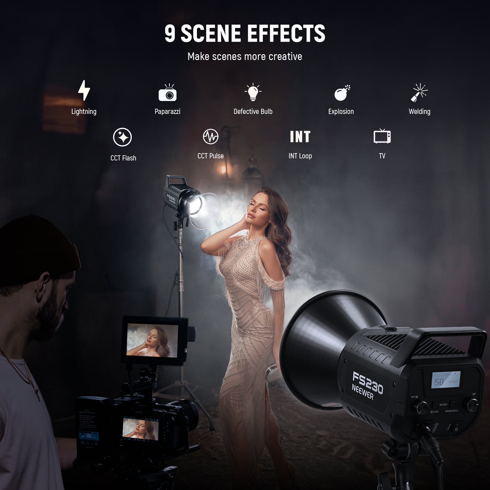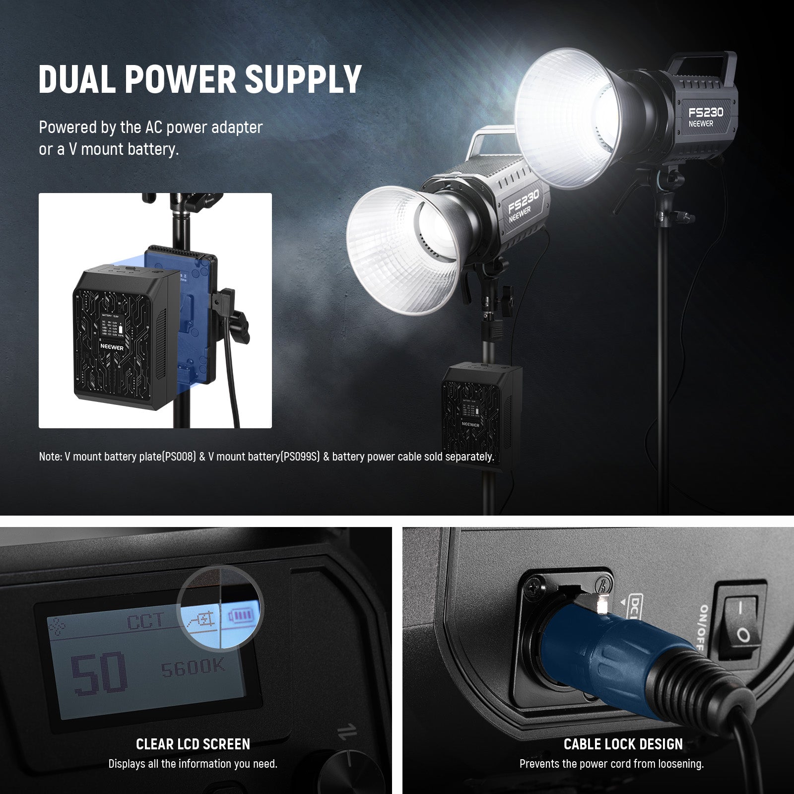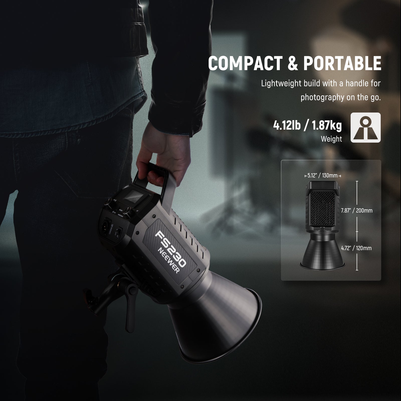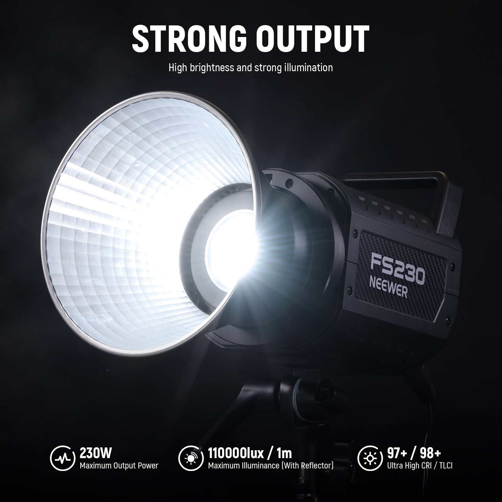 - Luce da studio compatta e potente da 230 W - La luce video LED FS230 di NEEWER (spina USA) utilizza LED COB efficienti per un'eccezionale potenza di uscita di 230 W e un'illuminazione massima di 110000 lux/m. Il faretto portatile pesa solo 3,8 libbre/1,7 kg, misura 7,9"x5,1"x4,7"/200x130x120 mm e ha un adattatore di montaggio flessibile con inclinazione di 180°, ideale per l'illuminazione di ritratti, interviste, registrazione video di YouTube/TikTok, riprese, streaming live e produzione in studio