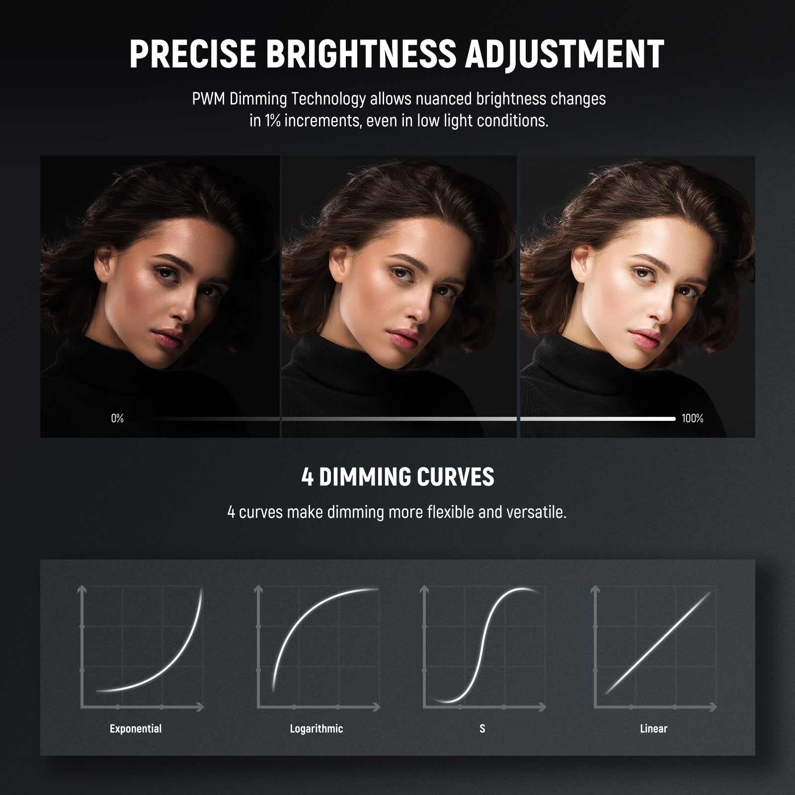 - PWM Dimming preciso e luce diurna a 5600K - La tecnologia di dimming PWM consente una regolazione precisa della luminosità da 0 a 100% con incrementi dell'1% senza sfarfallio e fornisce 4 tipi di dimming (esponenziale, logaritmico, S e lineare) per un dimming accurato in diverse condizioni. La luce diurna fredda a 5600K offre una temperatura di colore uniforme. CRI elevato 97+ e TLCI 98+ assicurano una resa cromatica fedele. 9 effetti FX rendono i video creativi e distinti