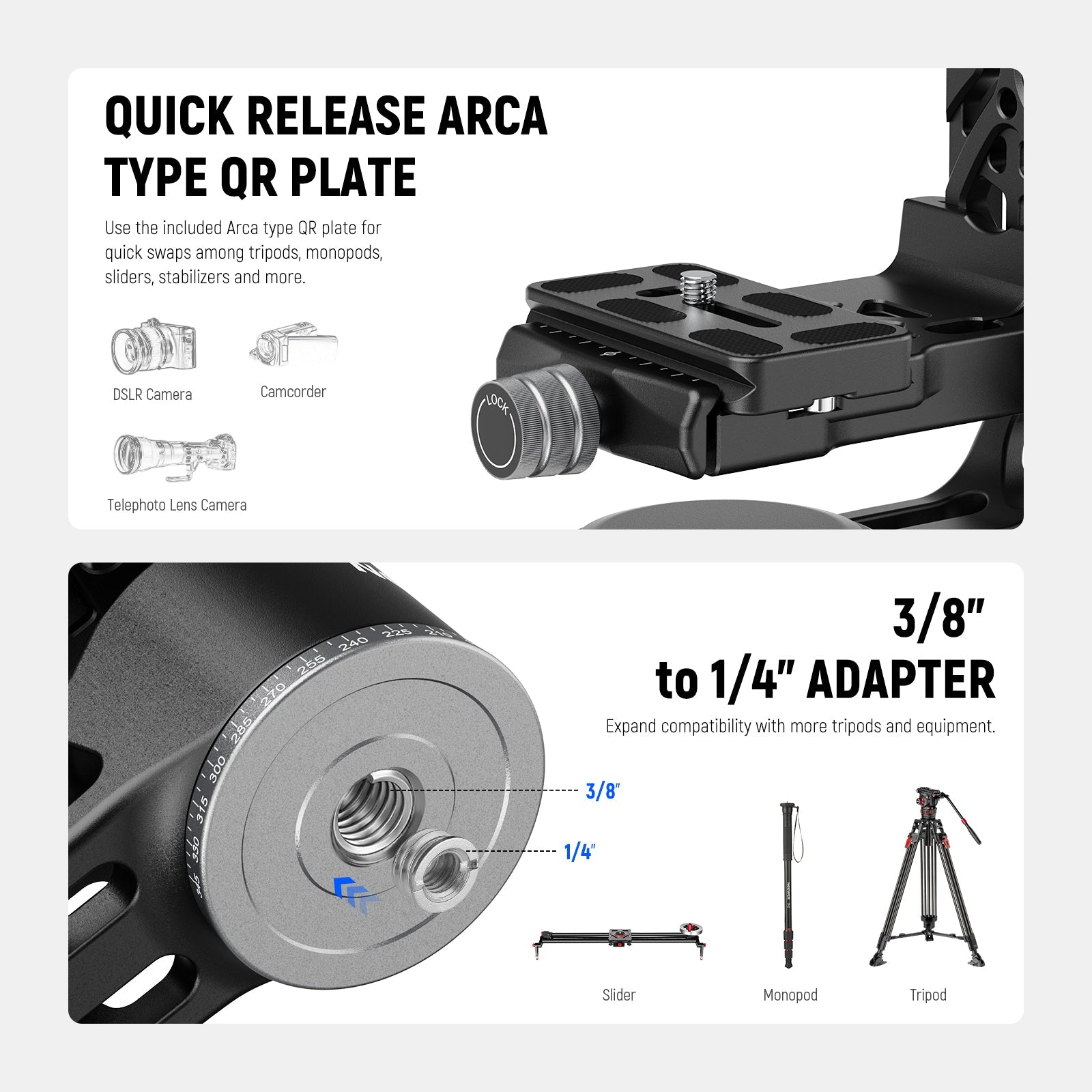 - Piastra a sgancio rapido Arca Type QR - Dite addio alla scomoda sostituzione del dispositivo. Utilizzate la piastra a sgancio rapido Arca Type QR inclusa per sostituire rapidamente treppiedi, monopiedi, slider, stabilizzatori e persino i supporti a clip per tracolla da zaino con sistemi di montaggio identici. La manopola laterale garantisce un bloccaggio sicuro e saldo, offrendovi la massima tranquillità durante le vostre sessioni fotografiche.