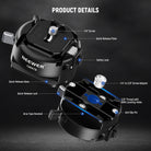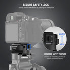 - Sistema di bloccaggio semplice e sicuro : fissare la piastra a sgancio rapido alla base del morsetto per il bloccaggio automatico, quindi utilizzare il pulsante di blocco di sicurezza per una maggiore sicurezza. Quando si rimuove la piastra a sgancio rapido, sbloccare il fermo girevole che si bloccherà nuovamente per evitare di schiacciare le dita durante la successiva installazione.
